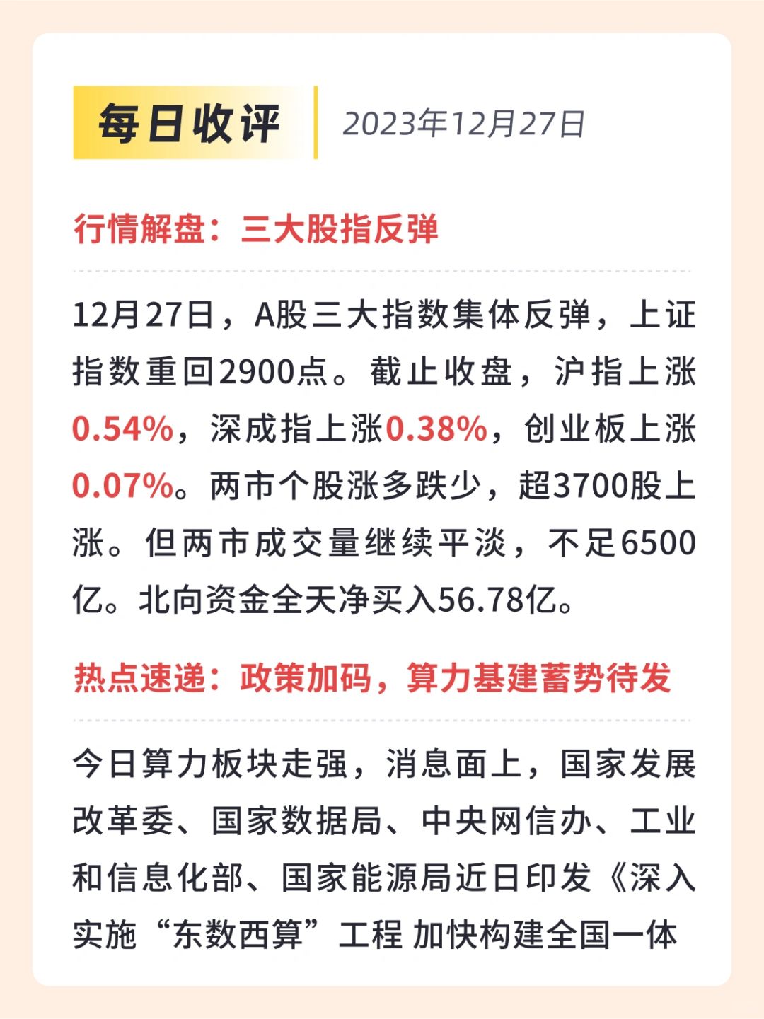 👉 12月27日,A股三大指数集体反弹,上证指数重回2900点。截止收盘,沪指上涨0.54%,深成指上涨0.38%,创业板上涨0.07%。两市个股涨多跌少,超3700股上涨。但两市成交量继续平淡,不足6500亿。北向资金全天净买入56.78亿。