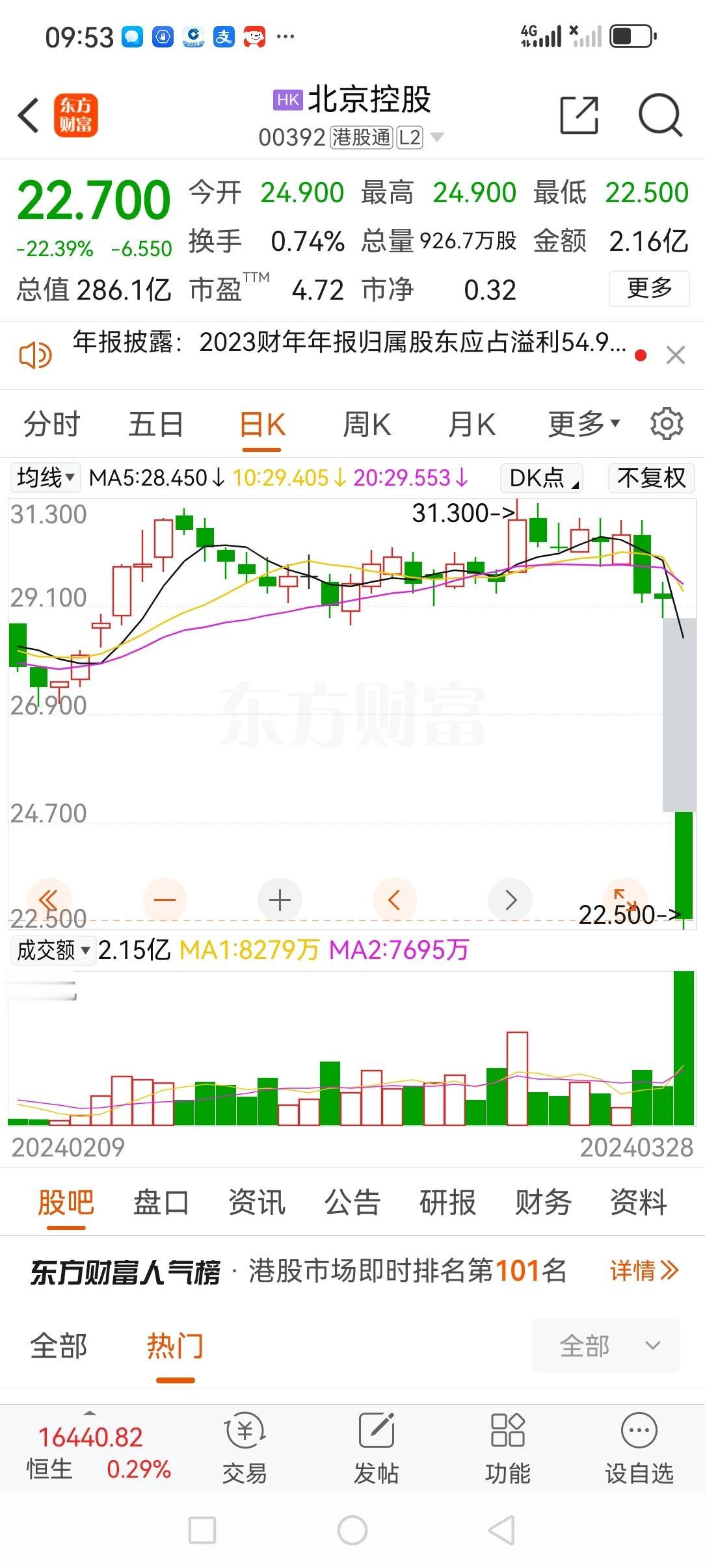 我的持股之一,“北京控股”今日暴跌24%。为什么我不慌? ★北京控股生意本身。 燃气供应、啤酒业务、供水业务、固废处理、管网输送,一切正常。 ★公司管理人员因素。 公司高管作为经营管理人员,同时也是政府官员身份。乱作为和贪腐行为,在现有大环境之下可能性不大。 ★我的合伙参股成本。 25港元/股,0.36PB、 5PE。 ★我的投资策略中的保护机制。 低估分散。严格控制单个行业、单个公司的投资占比。北京控股占我投资组合中的5%~6%而已。 ★要说有什么缺点。那就是北京控股今年的营业额增长3%,但是盈利却是-15%,同时年末的分红也不达预期。 但是不管怎样,我在北京控股这笔投资的年收益率仍然达到20%。股息率仍然达到8%。 所以仍然是持股收息,做一个理性的、安静的小股东。