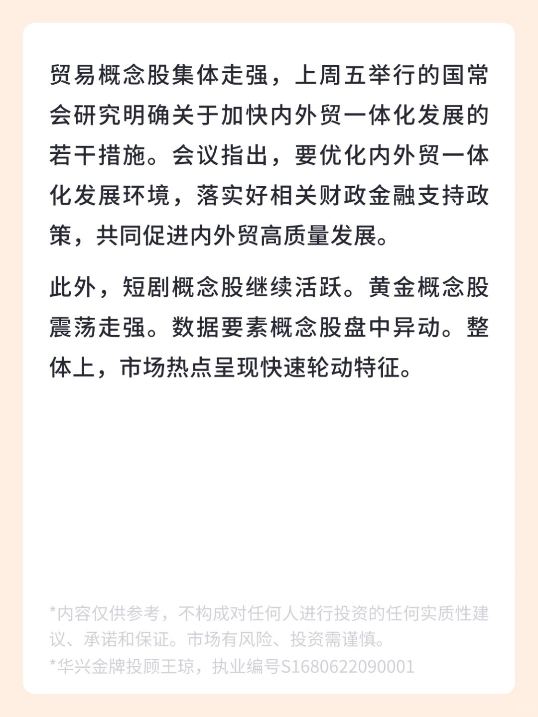 👉 贸易概念股集体走强,上周五举行的国常会研究明确关于加快内外贸一体化发展的若干措施。会议指出,要优化内外贸一体化发展环境,落实好相关财政金融支持政策,共同促进内外贸高质量发展。