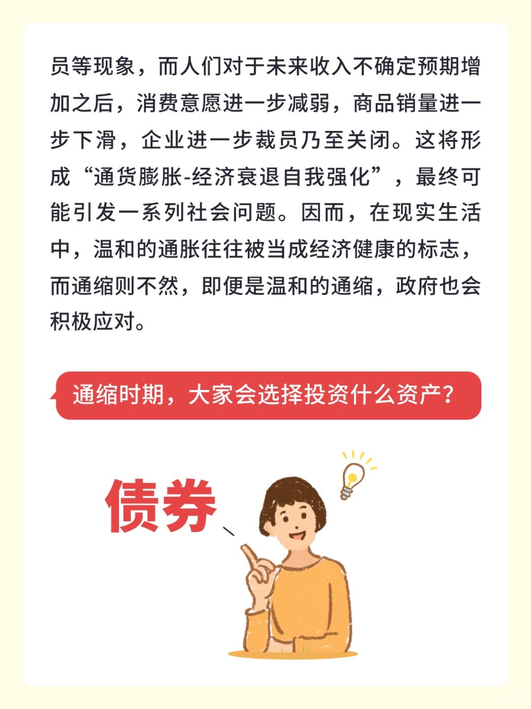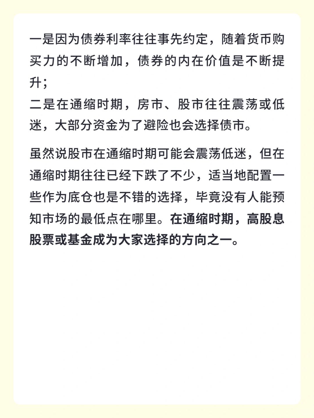 👉通缩时期,人们往往更愿意购买债券,一是因为债券利率往往事先约定,随着货币购买力的不断增加,债券的内在价值是不断提升;二是在通缩时期,房市、股市往往震荡或低迷,大部分资金为了避险也会选择债市。