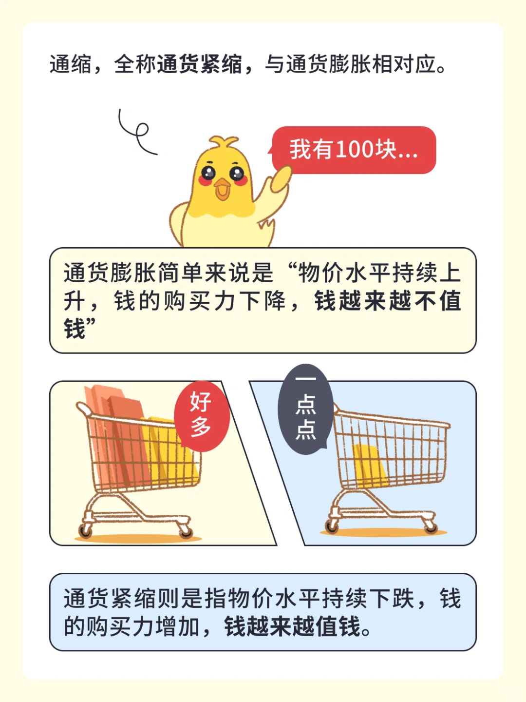 👉通缩,全称通货紧缩,与通货膨胀相对应。通货膨胀简单来说是“物价水平持续上升,钱的购买力下降,钱越来越不值钱”,通货紧缩则是指物价水平持续下跌,钱的购买力增加,钱越来越值钱。