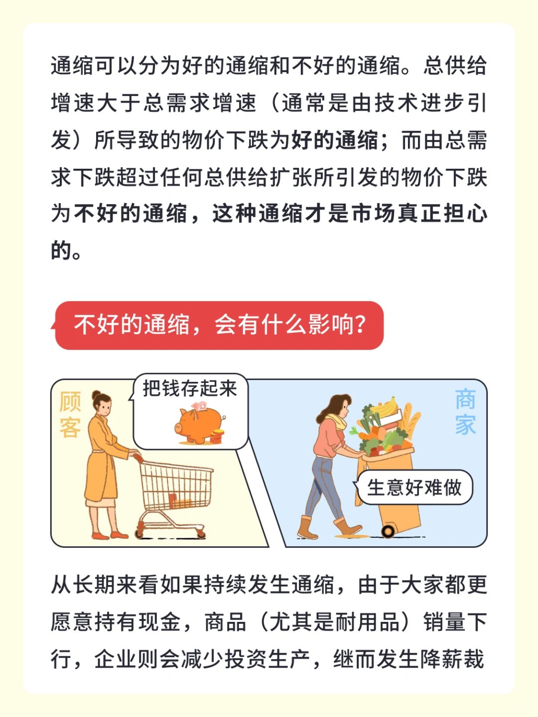 👉短期来看,同样的钱大家可以买到更多东西,当然开心,但长期来看,就需要分情况来看。通缩可以分为好的通缩和不好的通缩。总供给增速大于总需求增速(通常是由技术进步引发)所导致的物价下跌为好的通缩;而由总需求下跌超过任何总供给扩张所引发的物价下跌为不好的通缩,这种通缩才是市场真正担心的。