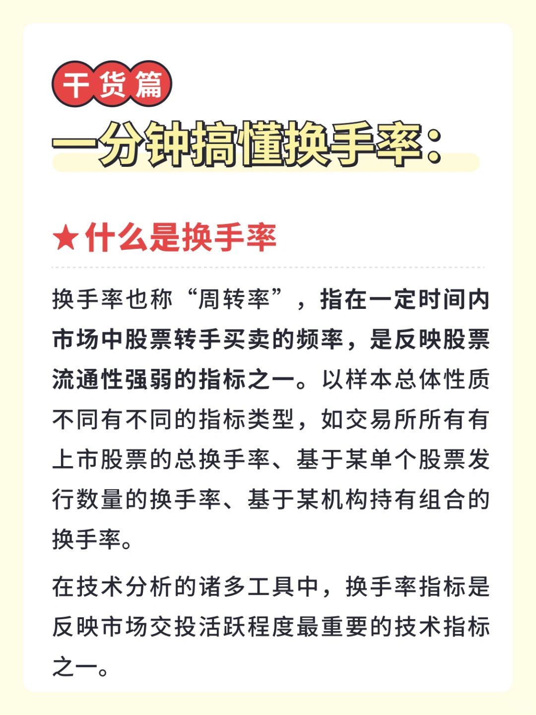 👉换手率也称“周转率”,指在一定时间内市场中股票转手买卖的频率,是反映股票流通性强弱的指标之一。以样本总体性质不同有不同的指标类型,如交易所所有有上市股票的总换手率、基于某单个股票发行数量的换手率、基于某机构持有组合的换手率。在技术分析的诸多工具中,换手率指标是反映市场交投活跃程度最重要的技术指标之一。