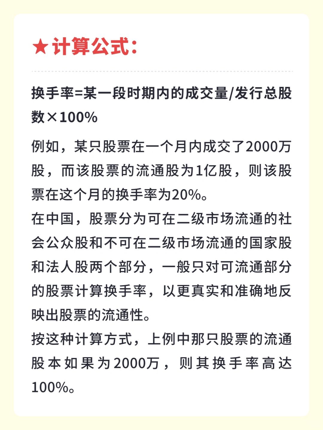 换手率=某一段时期内的成交量/发行总股数×100%例如,某只股票在一个月内成交了2000万股,而该股票的流通股为1亿股,则该股票在这个月的换手率为20%。在中国,股票分为可在二级市场流通的社会公众股和不可在二级市场流通的国家股和法人股两个部分,一般只对可流通部分的股票计算换手率,以更真实和准确地反映出股票的流通性。按这种计算方式,上例中那只股票的流通股本如果为2000万,则其换手率高达100%。在国外,通常是用某一段时期的成交金额与某一时点上的市值之间的比值来计算换手率。