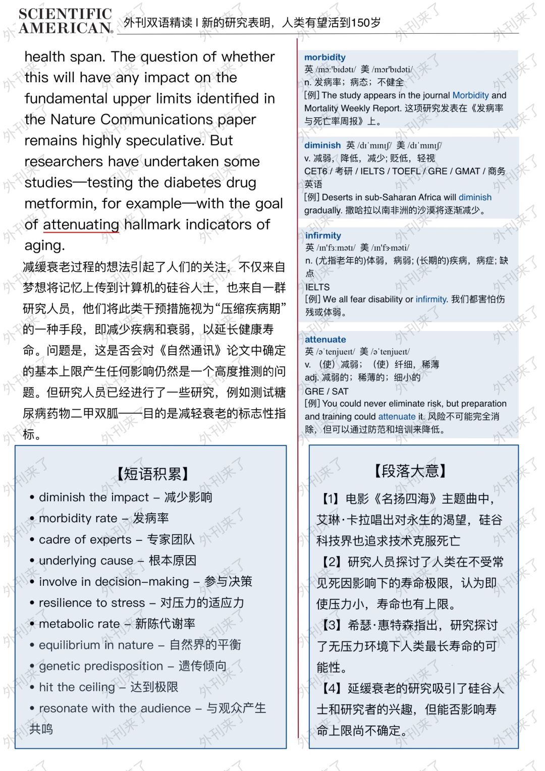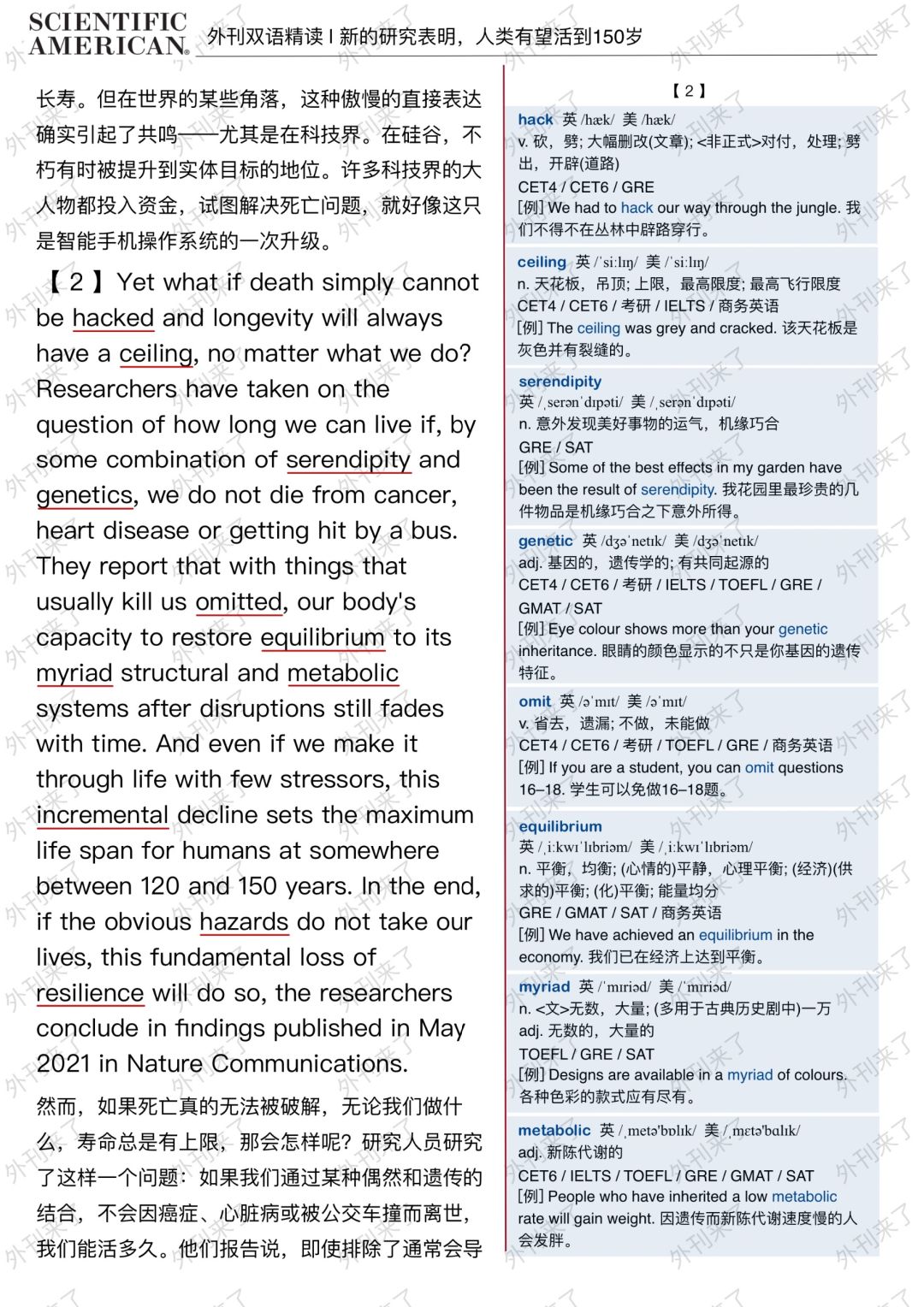 🔥英语学习必备的外刊精读 ⭐选自Scientific American ⭐每周会从原刊中选取多篇文章精读 🏆🏆重点单词⤵️ 🏅chorus 合唱歌曲 🏅longevity 寿命 🏅hubris 傲慢 🏅immortality 不朽 🏅corporeal 物质的 🏅ceiling 天花板 🏅serendipity 机缘巧合 🏅omit 省去 🏅equilibrium 平衡 🏅metabolic 新陈代谢的 🏅resilience 恢复力