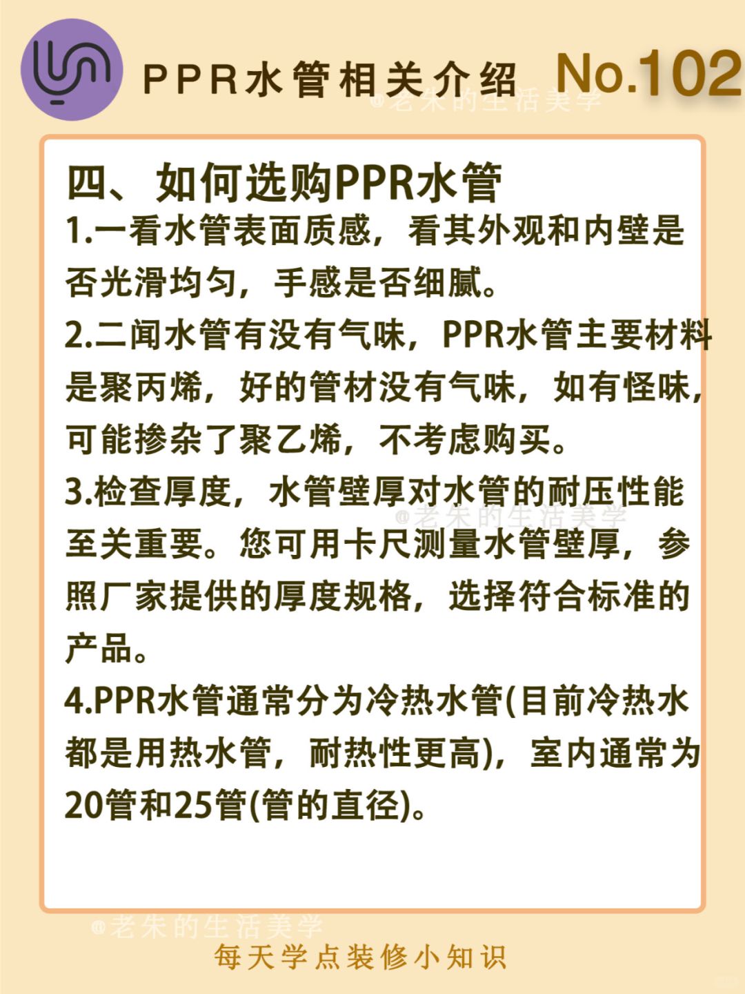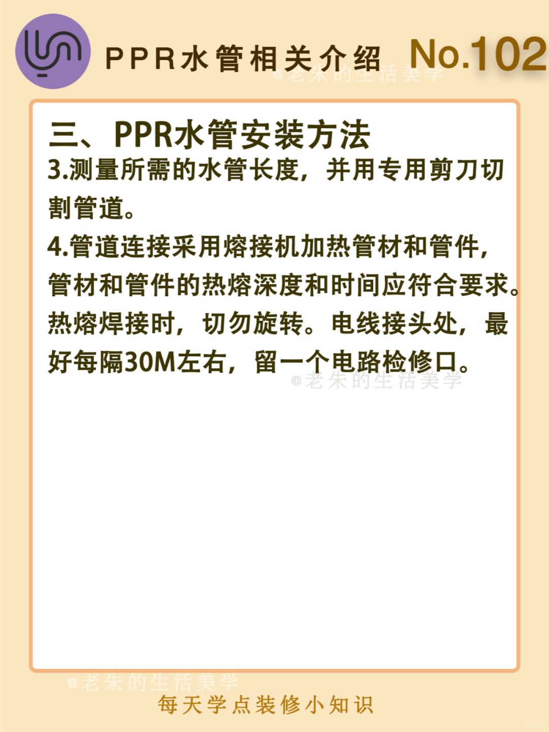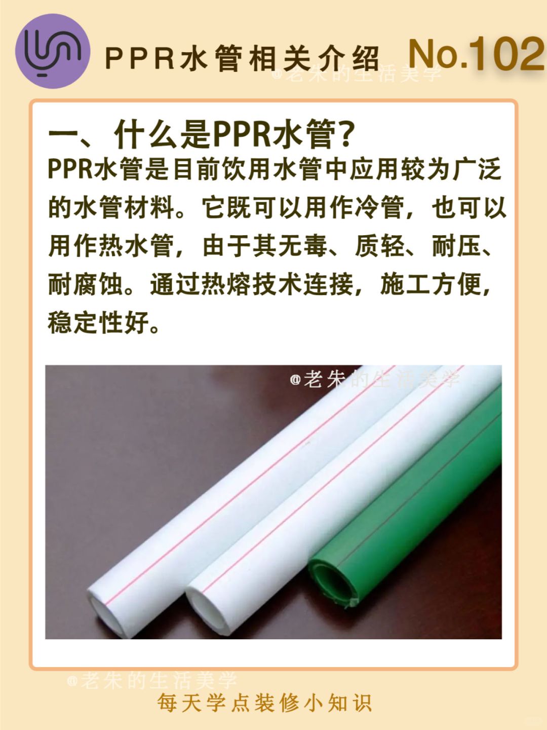 🔆 一、什么是PPR水管 二、PPR水管的特点 三、PPR水管安装方法 四、如何选购PPR水管 🔆 我是老朱 📍坐标天津 前上市公司金牌工长🏅 30年施工经验🛠 承接天津新房装修/老房改造 精心整理关于设计&施工&装修的攻略📝 关注我每日更新🗓 也可以在评论区留下您宝贵的想法与建议💓 让您装修不走弯路✅
