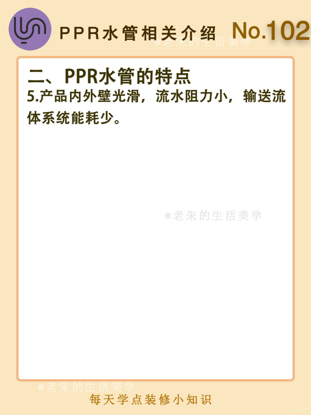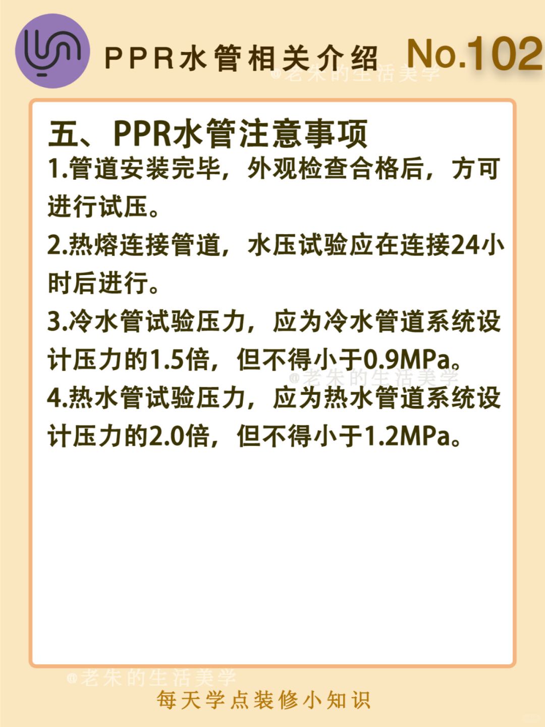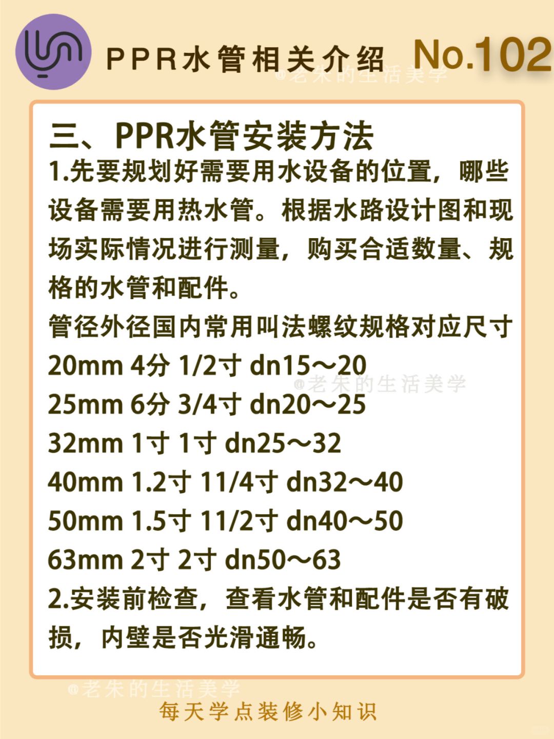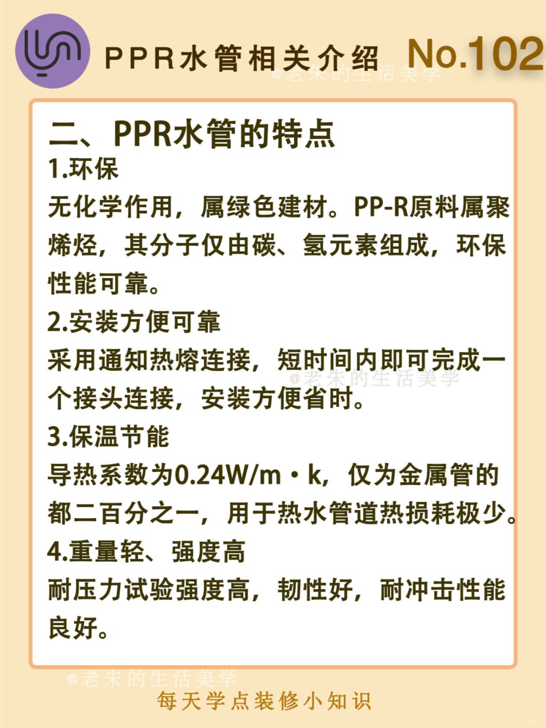 🔆 一、什么是PPR水管 二、PPR水管的特点 三、PPR水管安装方法 四、如何选购PPR水管 🔆 我是老朱 📍坐标天津 前上市公司金牌工长🏅 30年施工经验🛠 承接天津新房装修/老房改造 精心整理关于设计&施工&装修的攻略📝 关注我每日更新🗓 也可以在评论区留下您宝贵的想法与建议💓 让您装修不走弯路✅