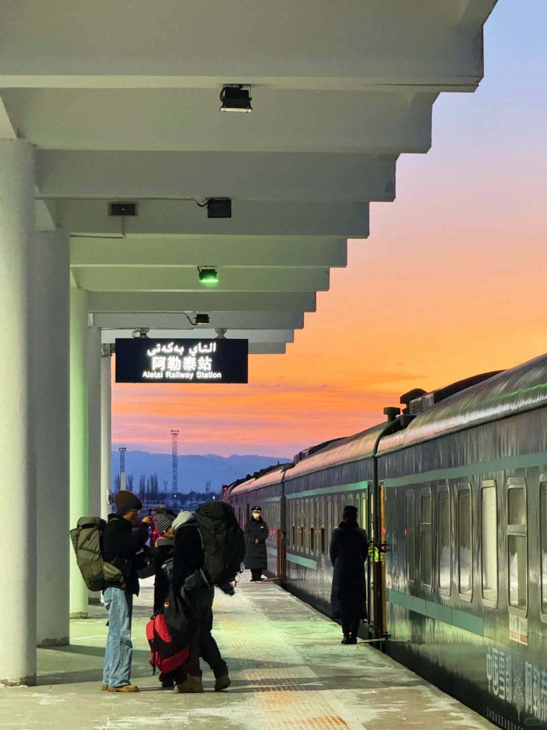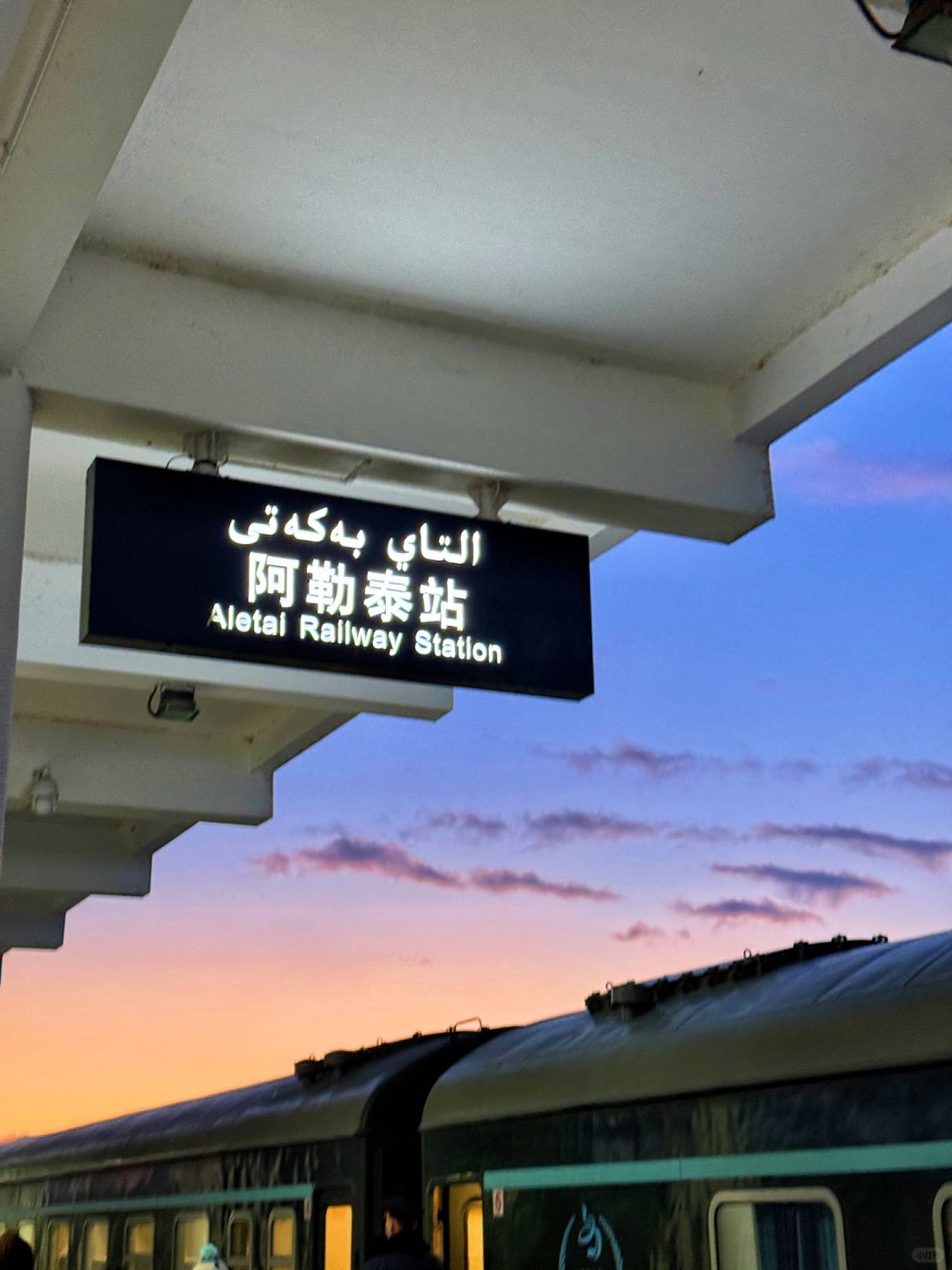 1️⃣我乘坐的是【乌鲁木齐—阿勒泰】的Y965趟列车,时间是23:20-9:01,第二天一早正好赶上阿勒泰的日出,天空的颜色真的巨美!