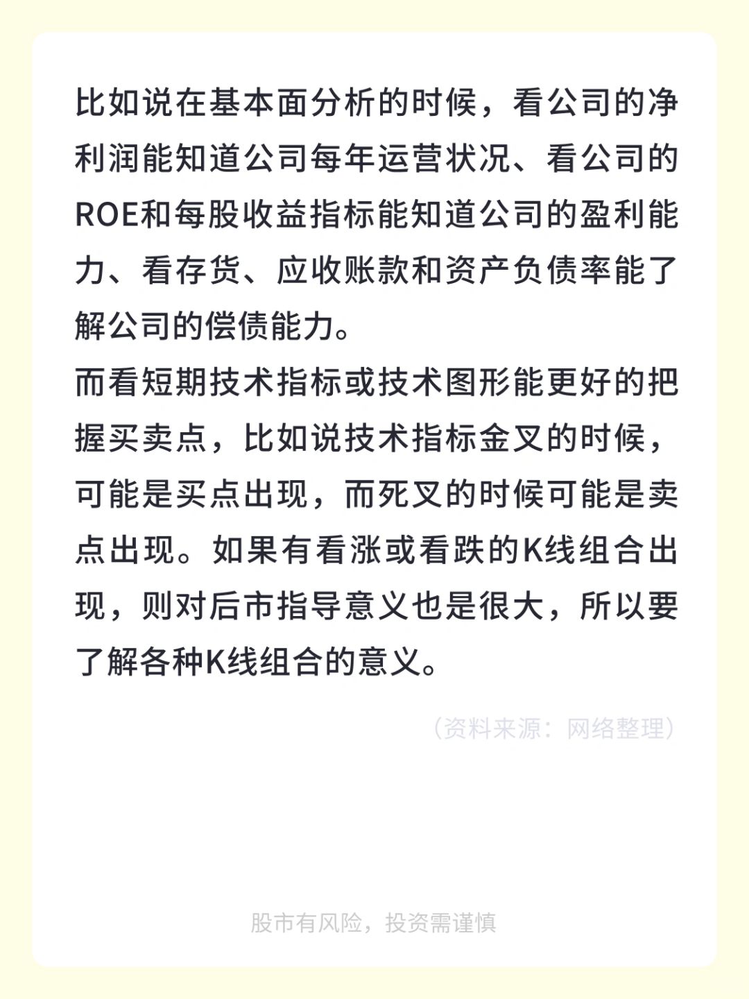 比如说在基本面分析的时候,看公司的净利润能知道公司每年运营状况、看公司的ROE和每股收益指标能知道公司的盈利能力、看存货、应收账款和资产负债率能了解公司的偿债能力。