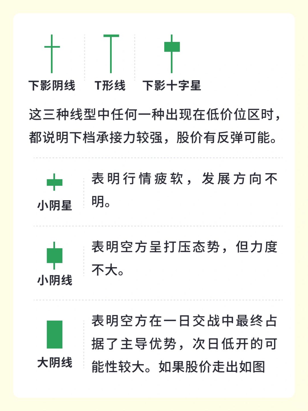 这三种线型中任何一种出现在低价位区时,都说明下档承接力较强,股价有反弹可能。
