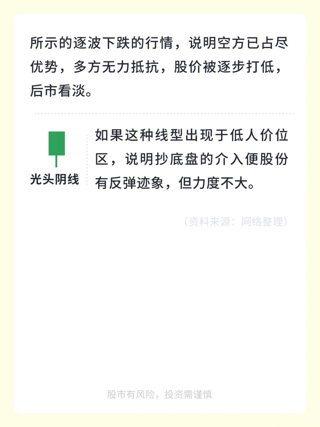 表明空方呈打压态势,但力度不大。大阴线:表明空方在一日交战中最终占据了主导优势,次日低开的可能性较大。如果股价走出如图所示的逐波下跌的行情,说明空方已占尽优势,多方无力抵抗,股价被逐步打低,后市看淡。