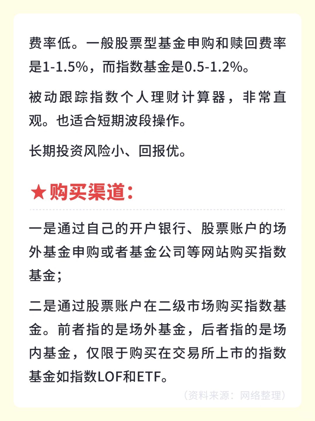 👉费率低。一般股票型基金申购和赎回费率是1-1.5%,而指数基金是0.5-1.2%;
