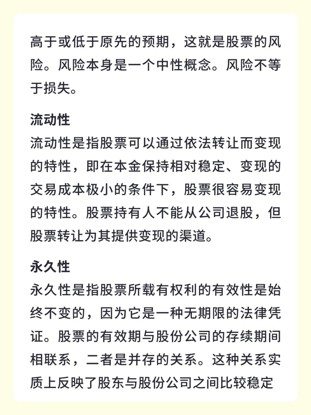 永久性是指股票所载有权利的有效性是始终不变的,因为它是一种无期限的法律凭证。股票的有效期与股份公司的存续期间相联系,二者是并存的关系。这种关系实质上反映了股东与股份公司之间比较稳定的经济关系。