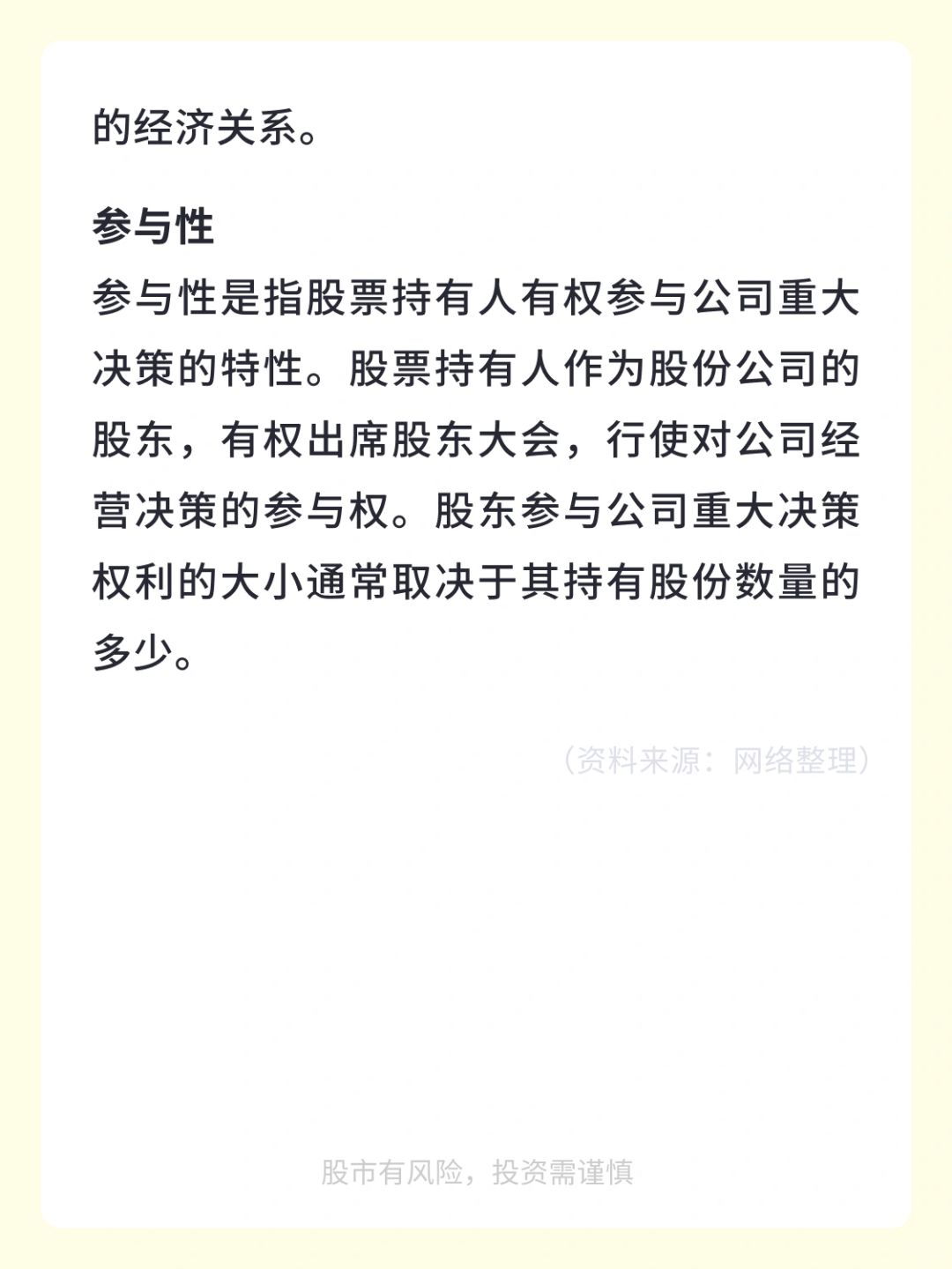 参与性是指股票持有人有权参与公司重大决策的特性。股票持有人作为股份公司的股东,有权出席股东大会,行使对公司经营决策的参与权。股东参与公司重大决策权利的大小通常取决于其持有股份数量的多少。