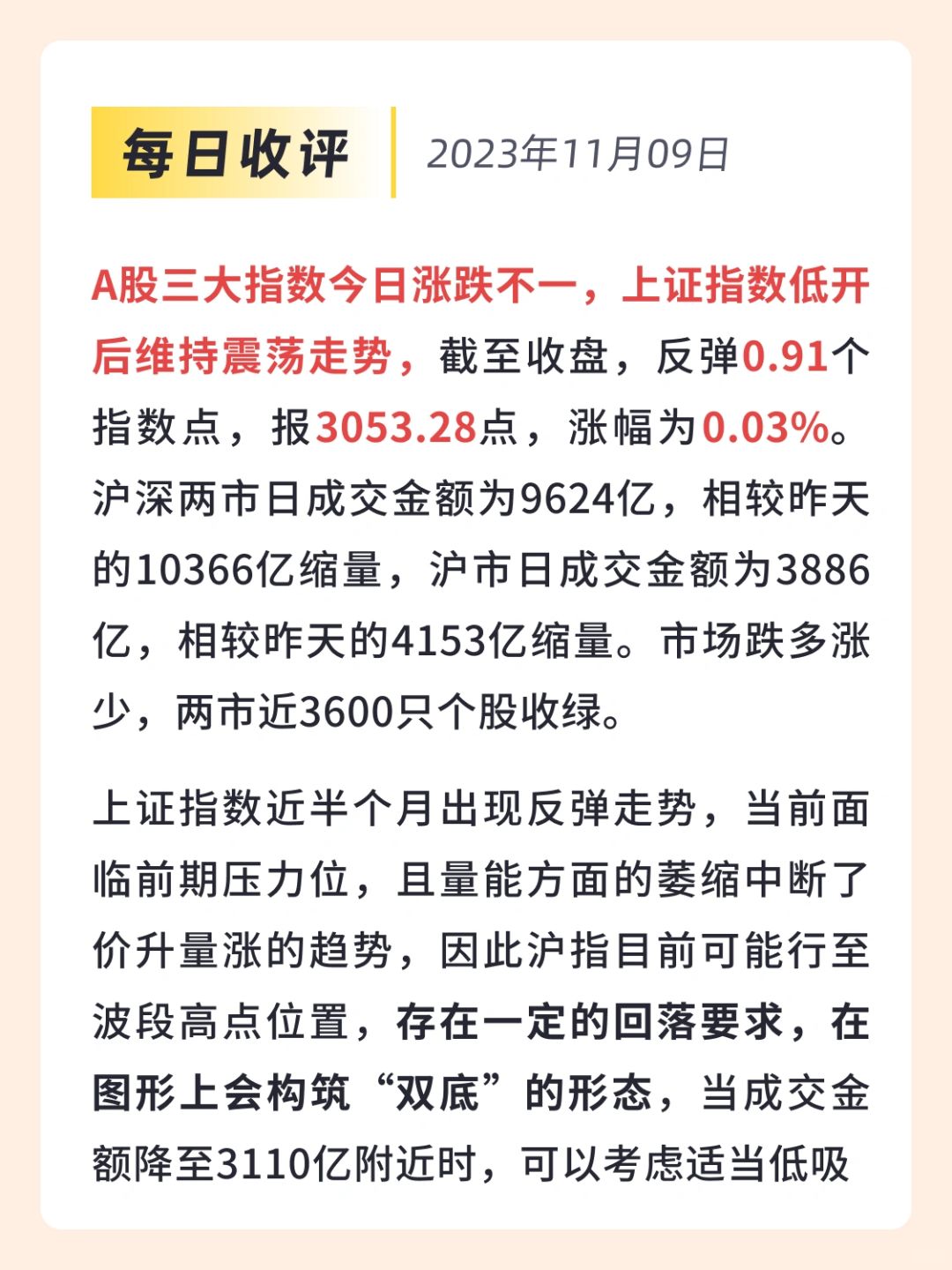 👉A股三大指数今日涨跌不一,上证指数低开后维持震荡走势,截至收盘,反弹0.91个指数点,报3053.28点,涨幅为0.03%。沪深两市日成交金额为9624亿,相较昨天的10366亿缩量,沪市日成交金额为3886亿,相较昨天的4153亿缩量。市场跌多涨少,两市近3600只个股收绿。
