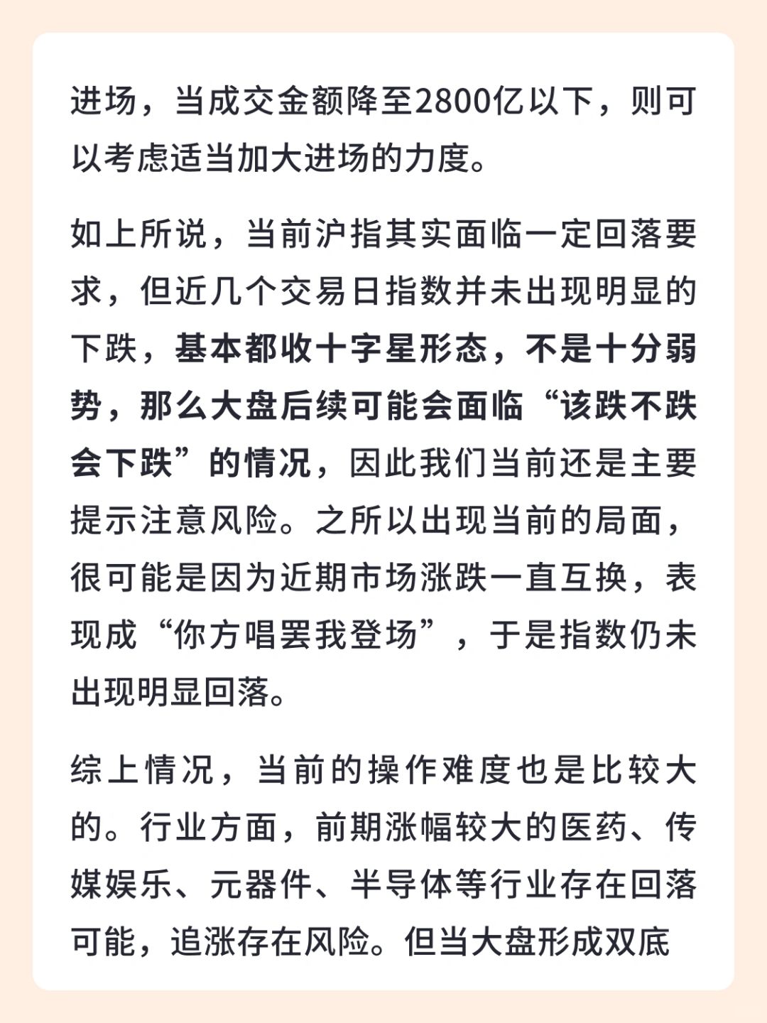👉综上情况,当前的操作难度也是比较大的。行业方面,前期涨幅较大的医药、传媒娱乐、元器件、半导体等行业存在回落可能,追涨存在风险。但当大盘形成双底时,可以考虑关注超跌的中特估相关机会,另外也可以关注箱体突破后缩量回抽确认的牛回头类型机会。
