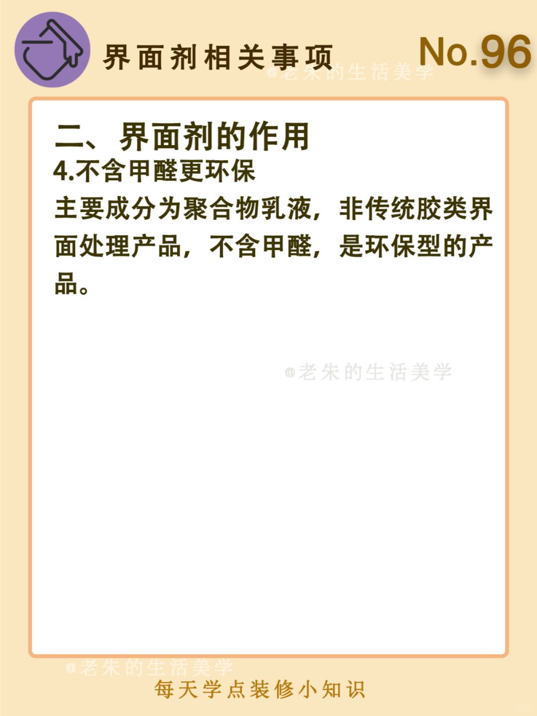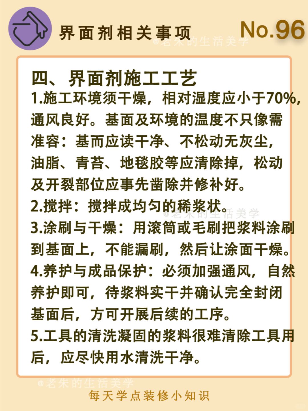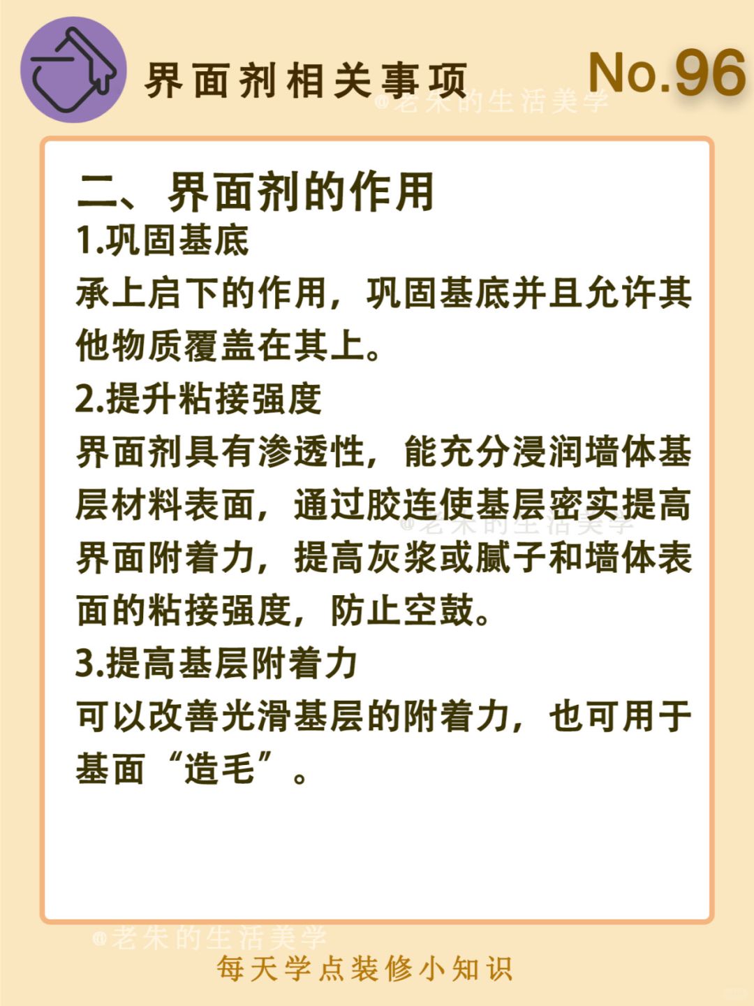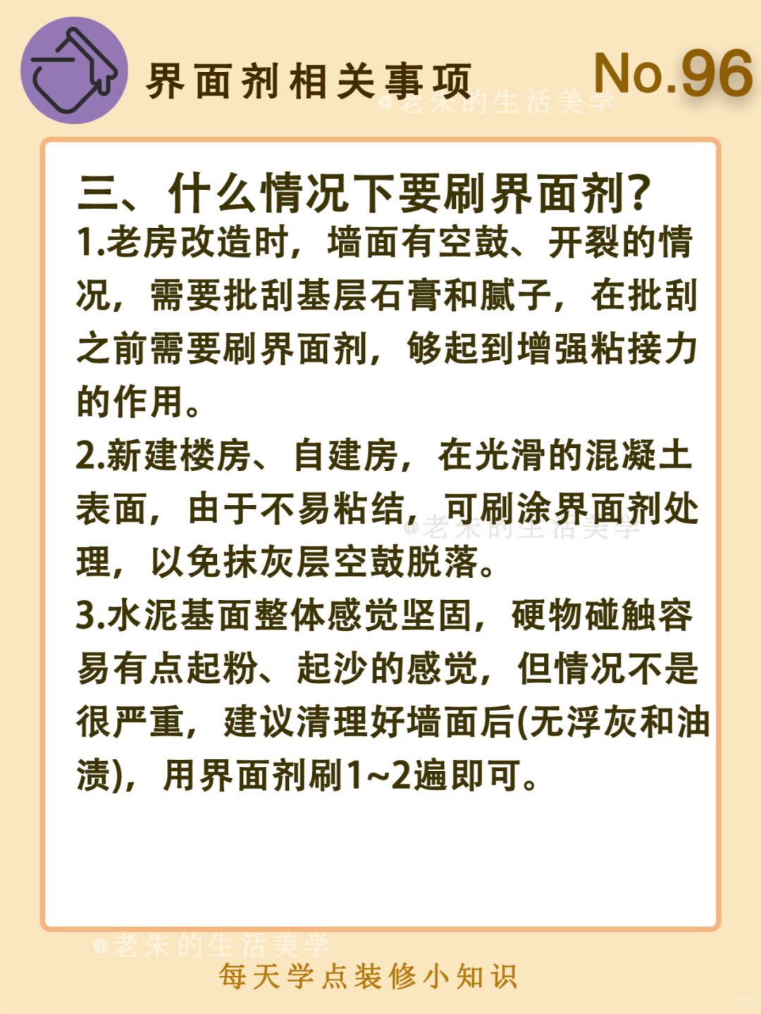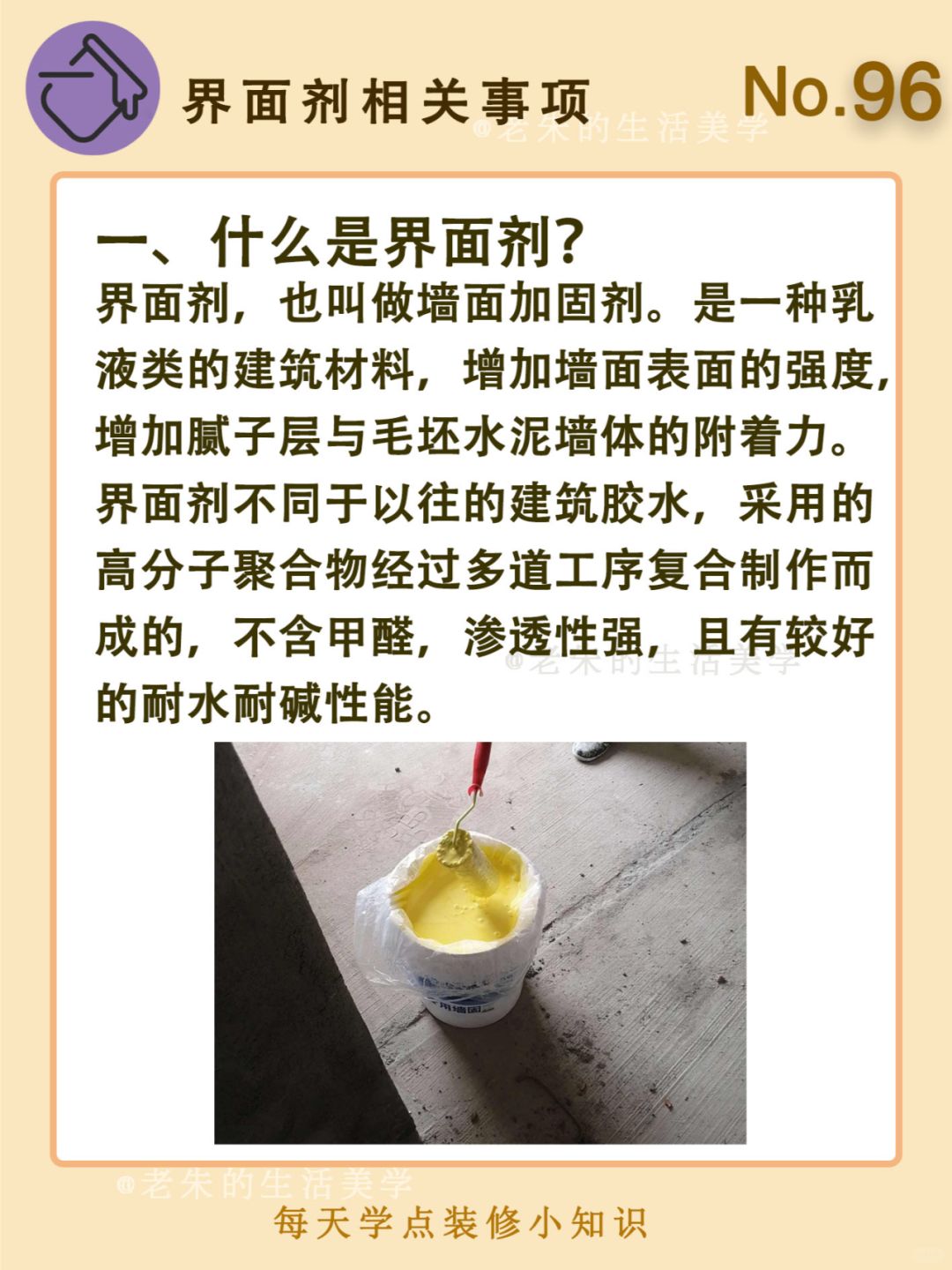 🔆 一、什么是界面剂 二、界面剂的作用 三、什么情况下要刷界面剂 四、界面剂施工工艺 🔆 我是老朱 📍坐标天津 前上市公司金牌工长🏅 30年施工经验🛠 承接天津新房装修/老房改造 精心整理关于设计&施工&装修的攻略📝 关注我每日更新🗓 也可以在评论区留下您宝贵的想法与建议💓 让您装修不走弯路✅