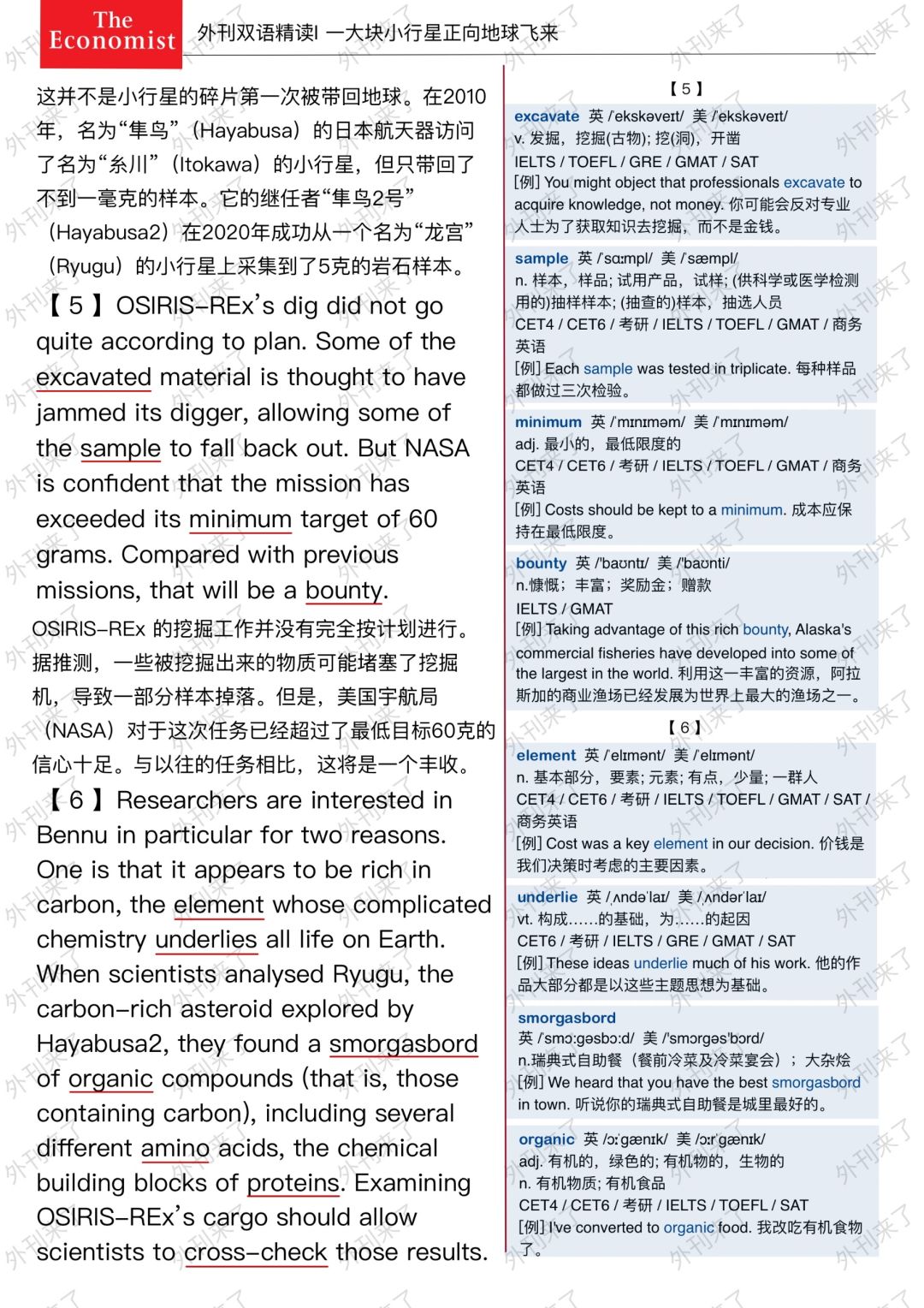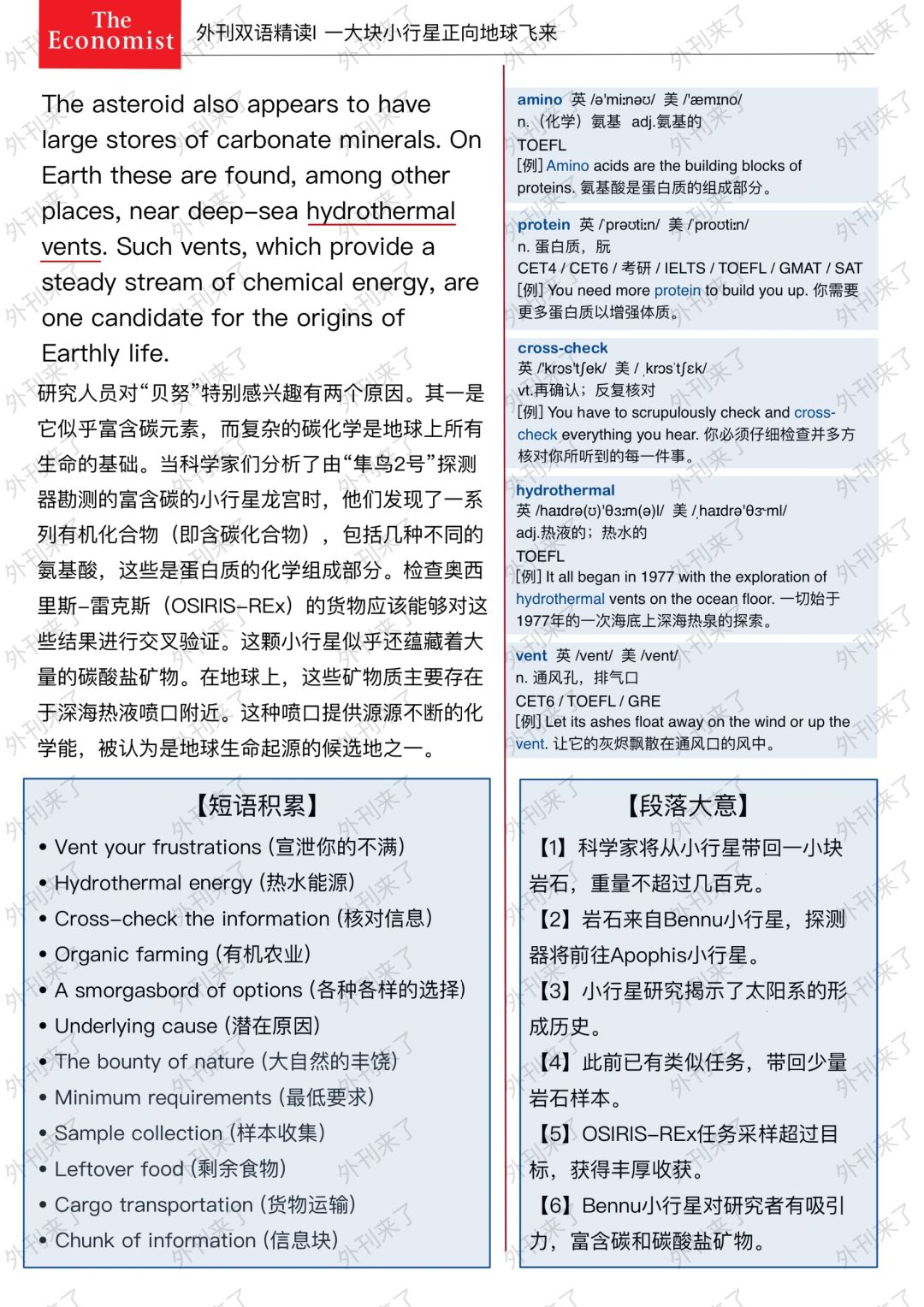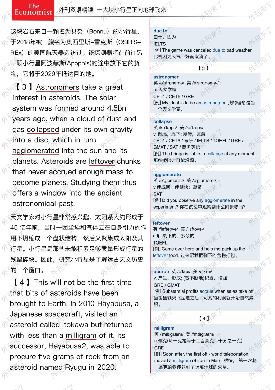 🔥英语学习必备的外刊精读 ⭐选自The Economist ⭐每周会从原刊中选取多篇文章精读 🏆🏆重点单词⤵️ 🏅chunk 大块 🏅asteroid 小行星 🏅gram 克 🏅capsule 胶囊 🏅parachute 降落伞 🏅cargo 货物 🏅due to 因为 🏅astronomer 天文学家 🏅leftover 剩下的