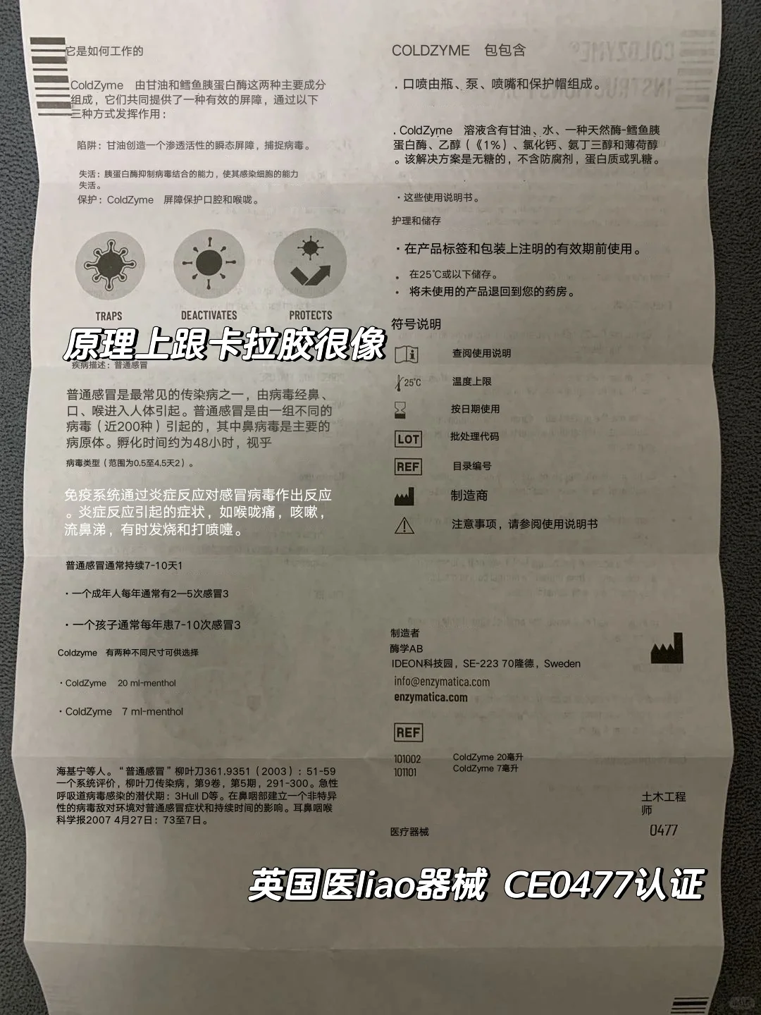 [一R]这是一款英国的口腔喷雾,用于预prevent防,alleviate缓解感冒症状和喉咙痛。主要配方是甘油和鳕鱼胰蛋白酶。 [二R]原理就是通过甘油阻隔🦠,胰蛋白酶让🦠失活,从而保护口腔和喉咙。 [三R]分为7ml和20ml容量两种。 [四R]成人和4岁以上儿童可用。 [五R]保质期长,口感是甜的[偷笑R]
