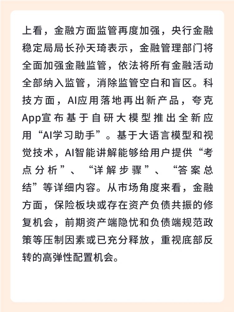 👉 金融和科技板块今日轻微回调。从消息面上看,金融方面监管再度加强,央行金融稳定局局长孙天琦表示,金融管理部门将全面加强金融监管,依法将所有金融活动全部纳入监管,消除监管空白和盲区。科技方面,AI应用落地再出新产品,夸克App宣布基于自研大模型推出全新应用“AI学习助手”。基于大语言模型和视觉技术,AI智能讲解能够给用户提供“考点分析”、“详解步骤”、“答案总结”等详细内容。从市场角度来看,金融方面,保险板块或存在资产负债共振的修复机会,前期资产端隐忧和负债端规范政策等压制因素或已充分释放,重视底部反转的高弹性配置机会。