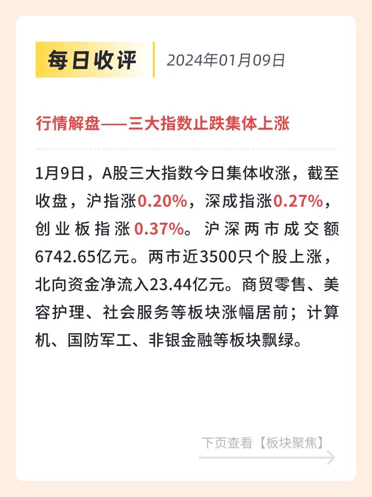 👉 1月9日,A股三大指数今日集体收涨,截至收盘,沪指涨0.20%,深成指涨0.27%,创业板指涨0.37%。沪深两市成交额6742.65亿元。两市近3500只个股上涨,北向资金净流入23.44亿元。商贸零售、美容护理、社会服务等板块涨幅居前;计算机、国防军工、非银金融等板块飘绿。