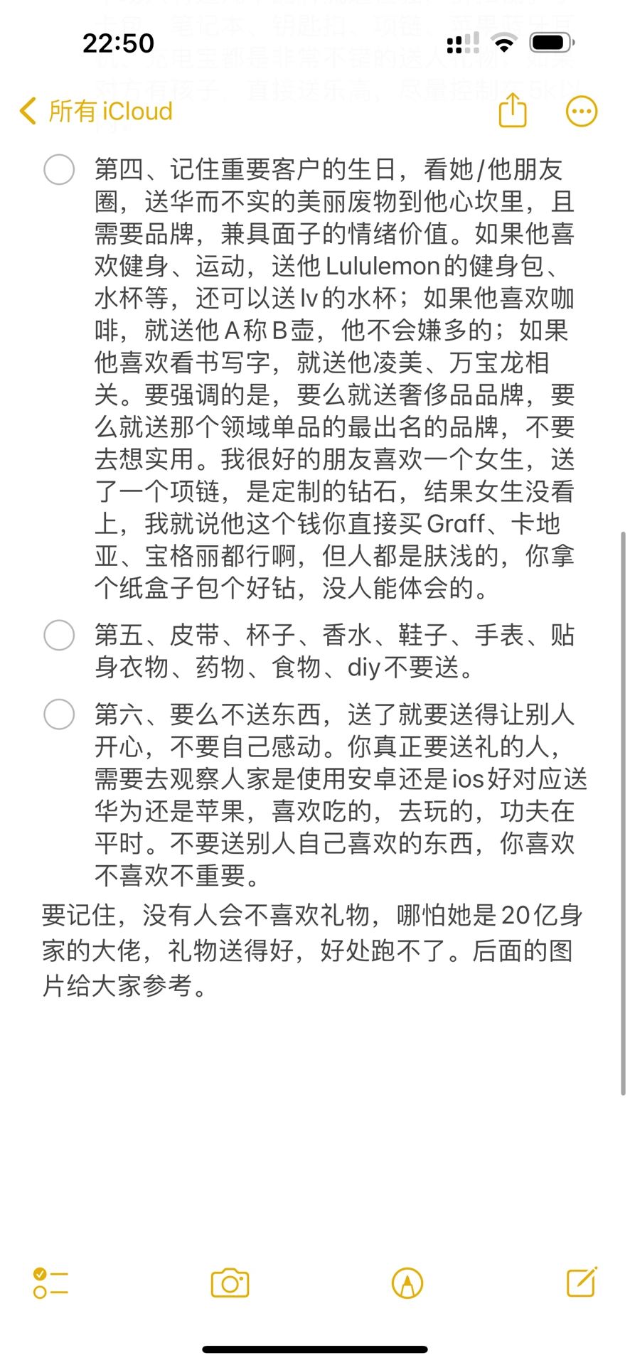 第六、要么不送东西,送了就要送得让别人开心,不要自己感动。你真正要送礼的人,需要去观察人家是使用安卓还是ios好对应送华为还是苹果,喜欢吃的,去玩的,功夫在平时。不要送别人自己喜欢的东西,你喜欢不喜欢不重要。