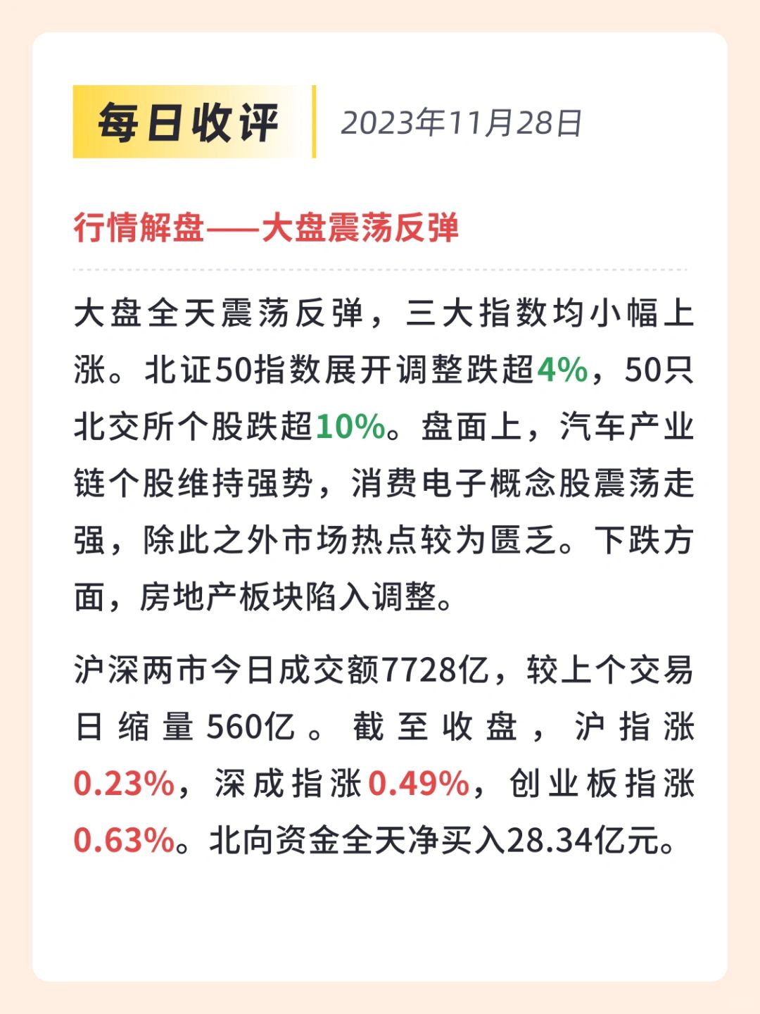 👉 大盘全天震荡反弹,三大指数均小幅上涨。北证50指数展开调整跌超4%,50只北交所个股跌超10%。盘面上,汽车产业链个股维持强势,消费电子概念股震荡走强,除此之外市场热点较为匮乏。下跌方面,房地产板块陷入调整。