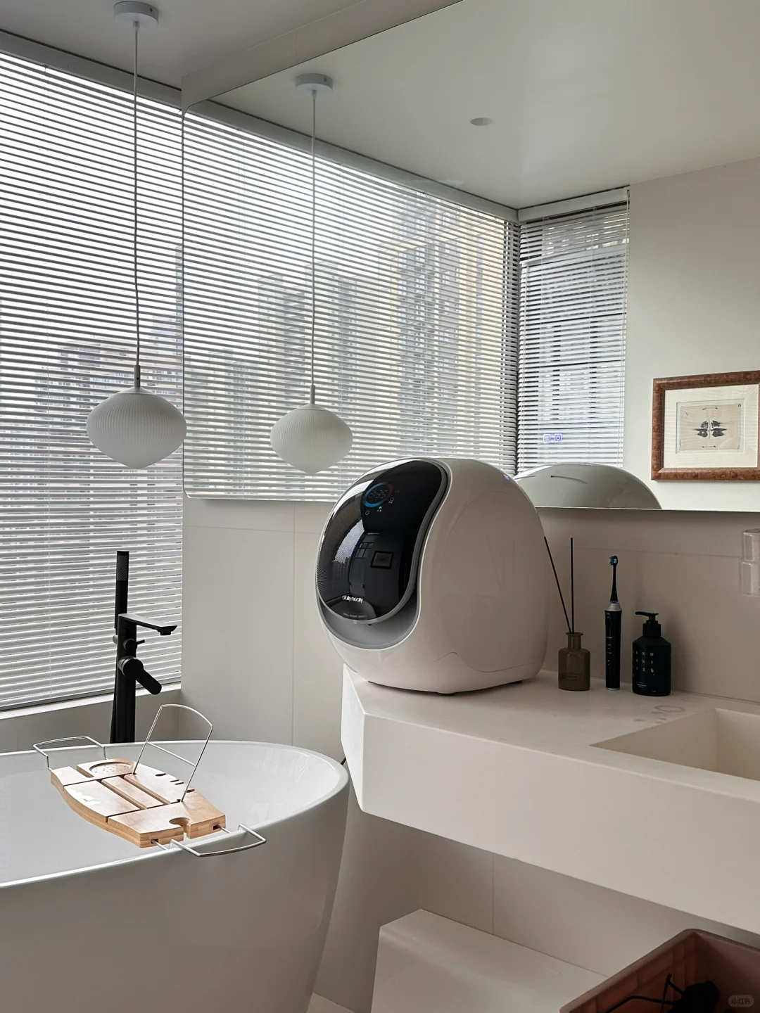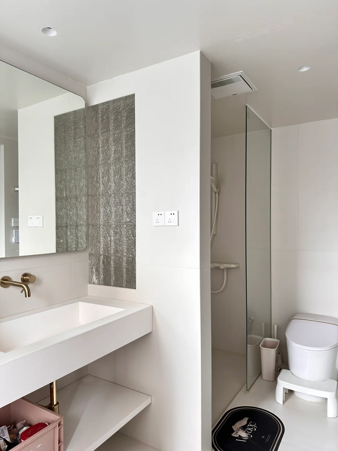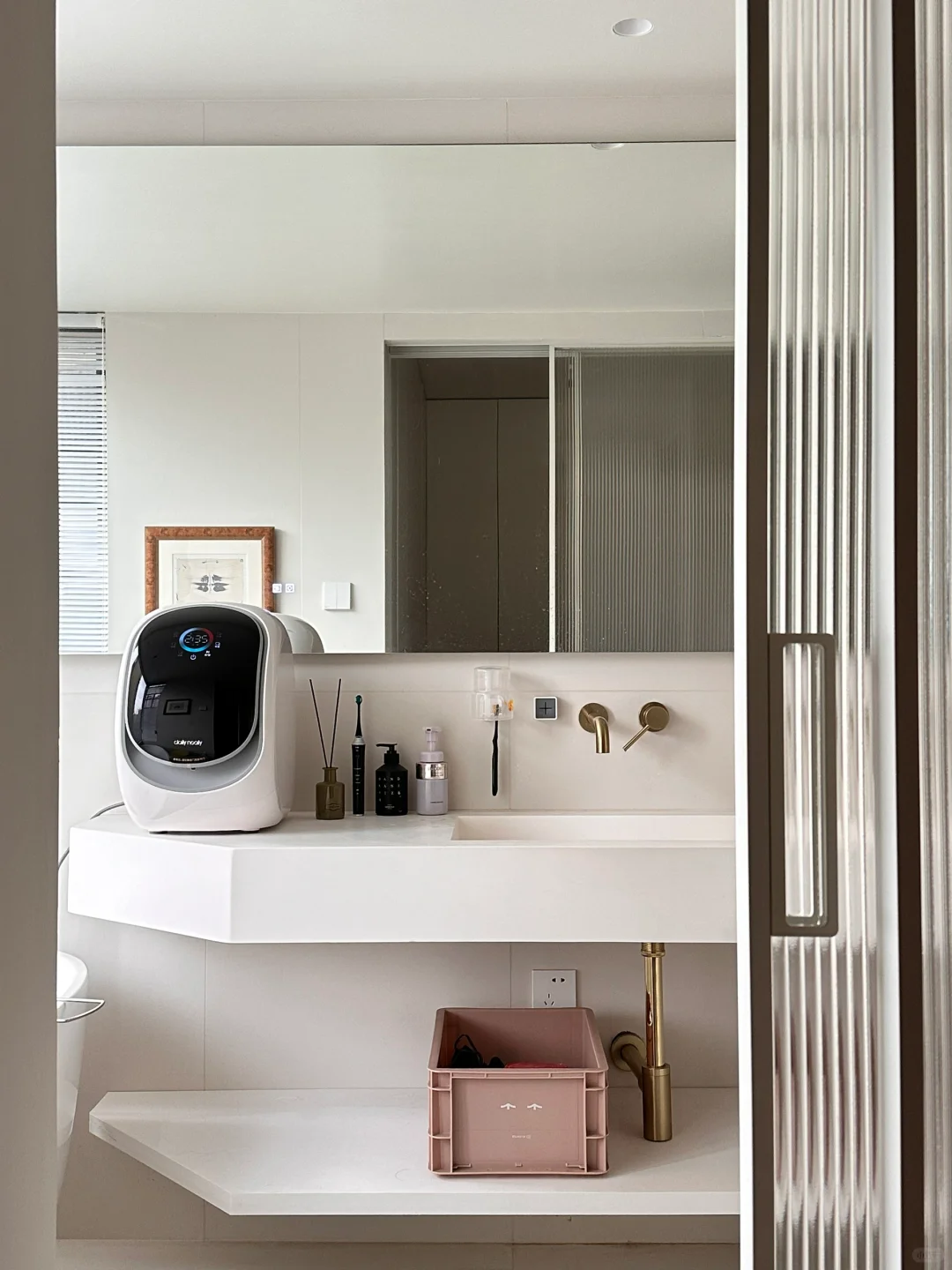 2️⃣洗手台是卫生间的灵魂,我家全白人造石台盆定制的还挺满意的,无缝拼接,不容易藏污纳垢🧹更卫生,整体色调协调,空间立马就大了很多~