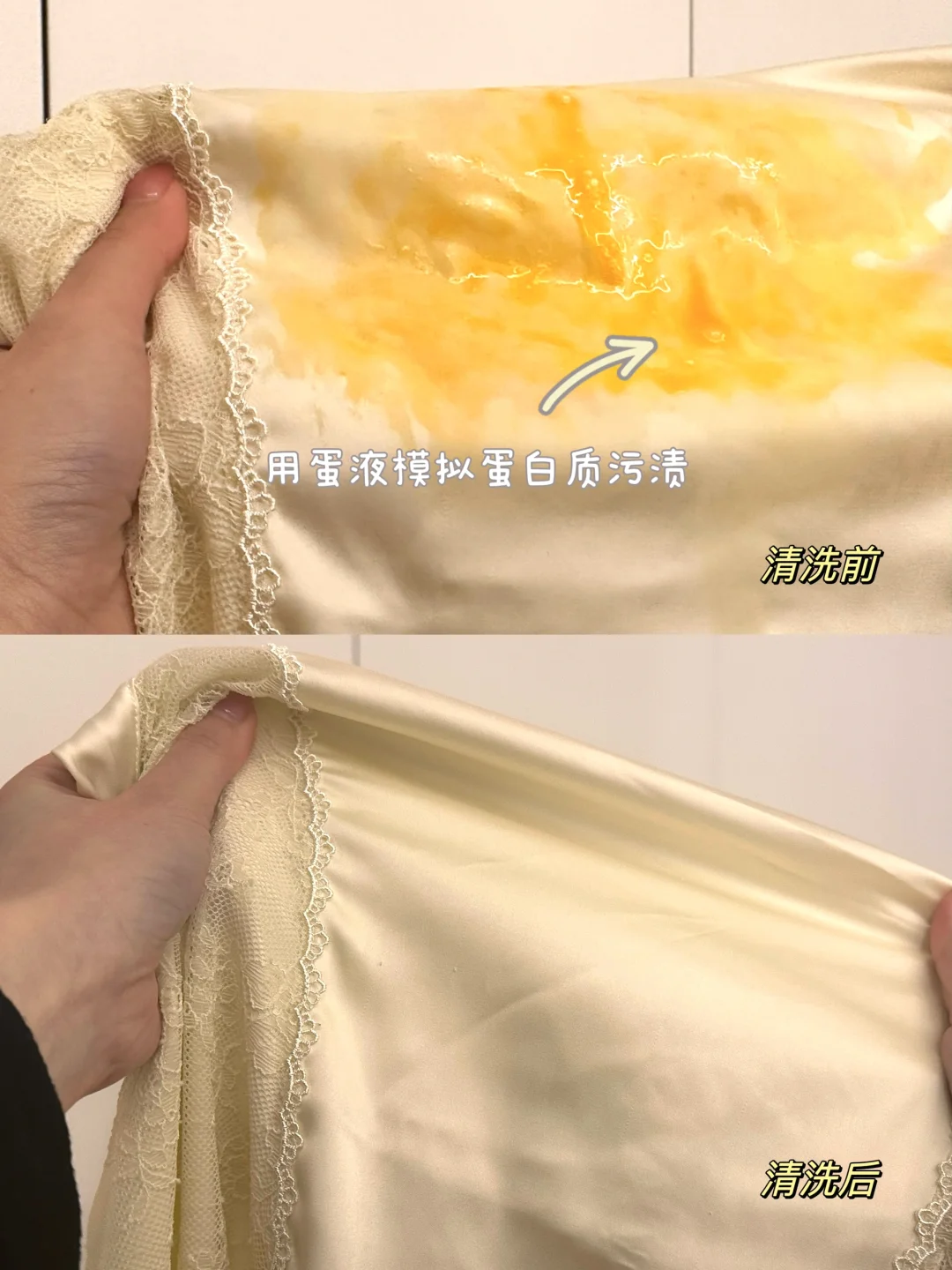 先温水洗涤后低温烘干不伤衣物,不会发硬,依旧很柔软~