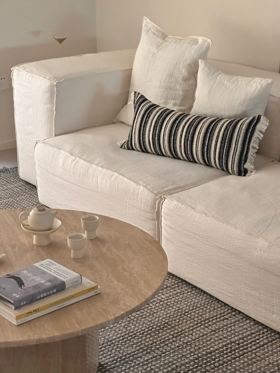 亚麻沙发边上摆放了落地灯💡和小边几