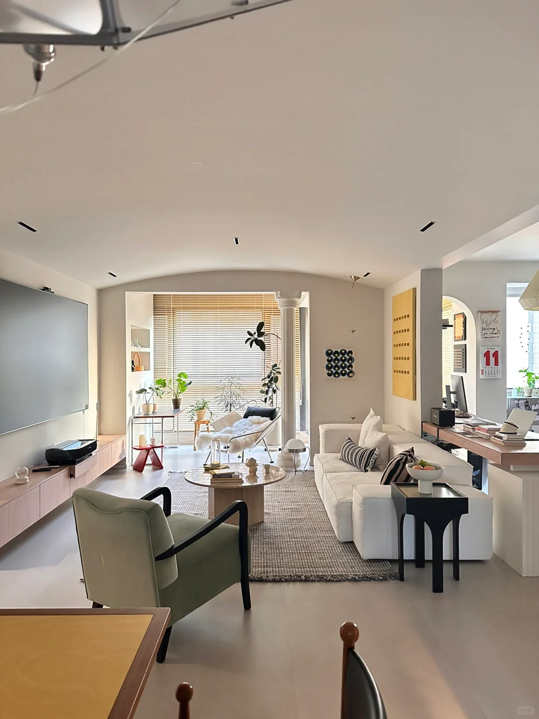2️⃣客厅无主灯设计,弧形吊顶显层高,没有电视背景墙,电视机柜是定制的