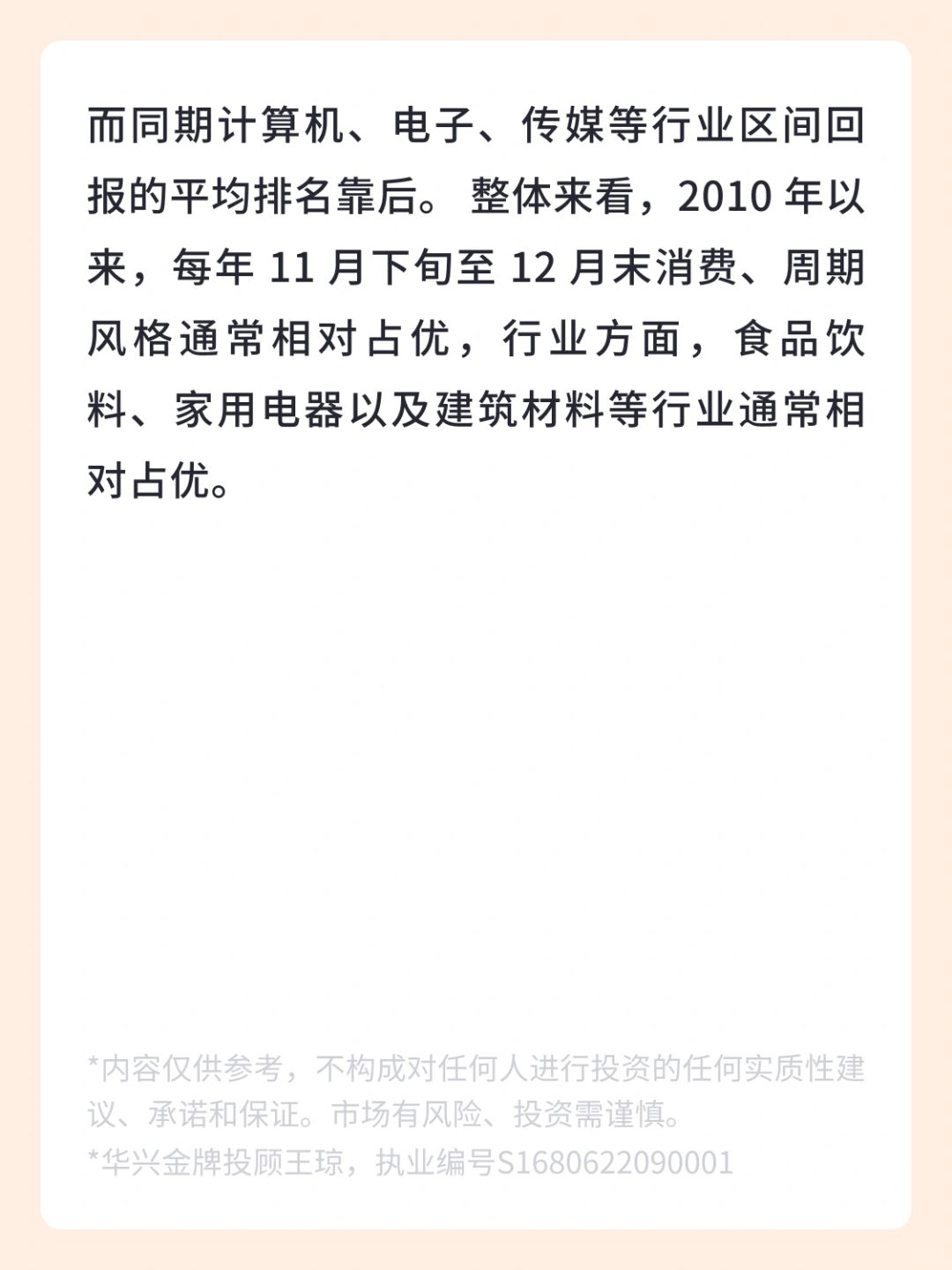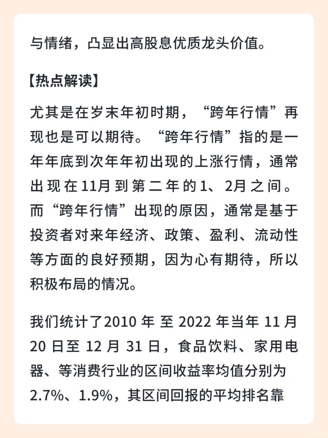 👉 我们统计了2010 年 至 2022 年当年 11 月 20 日至 12 月 31 日,食品饮料、家用电器、等消费行业的区间收益率均值分别为 2.7%、1.9%,其区间回报的平均排名靠 ,而同期计算机、电子、传媒等行业区间回报的平均排名靠后。 整体来看,2010 年以来,每年 11 月下旬至 12 月末消费、周期风格通常相对占优,行业方面,食品饮料、家用电器以及建筑材料等行业通常相对占优。