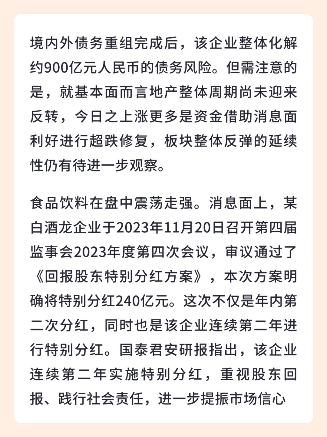 👉 食品饮料在盘中震荡走强。消息面上,某白酒龙企业于2023年11月20日召开第四届监事会2023年度第四次会议,审议通过了《回报股东特别分红方案》,本次方案明确将特别分红240亿元。这次不仅是年内第二次分红,同时也是该企业连续第二年进行特别分红。国泰君安研报指出,该企业连续第二年实施特别分红,重视股东回报、践行社会责任,进一步提振市场信心与情绪,凸显出高股息优质龙头价值。