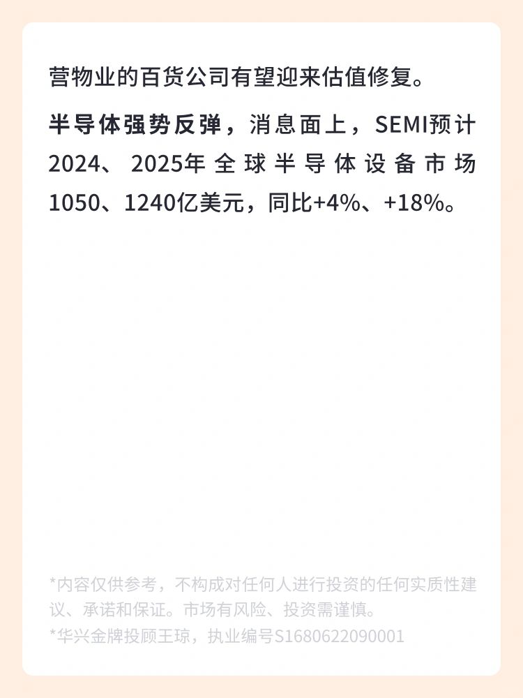 👉 半导体强势反弹,消息面上,SEMI预计2024、2025年全球半导体设备市场1050、1240亿美元,同比+4%、+18%。