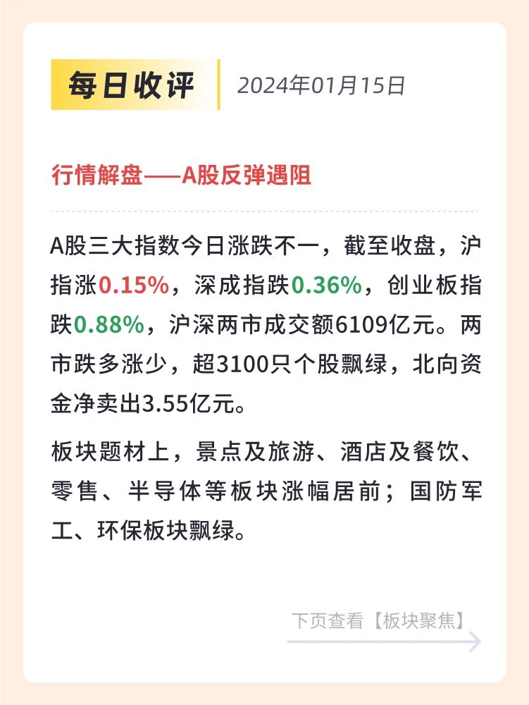 👉 A股三大指数今日涨跌不一,截至收盘,沪指涨0.15%,深成指跌0.36%,创业板指跌0.88%,沪深两市成交额6109亿元。两市跌多涨少,超3100只个股飘绿,北向资金净卖出3.55亿元。