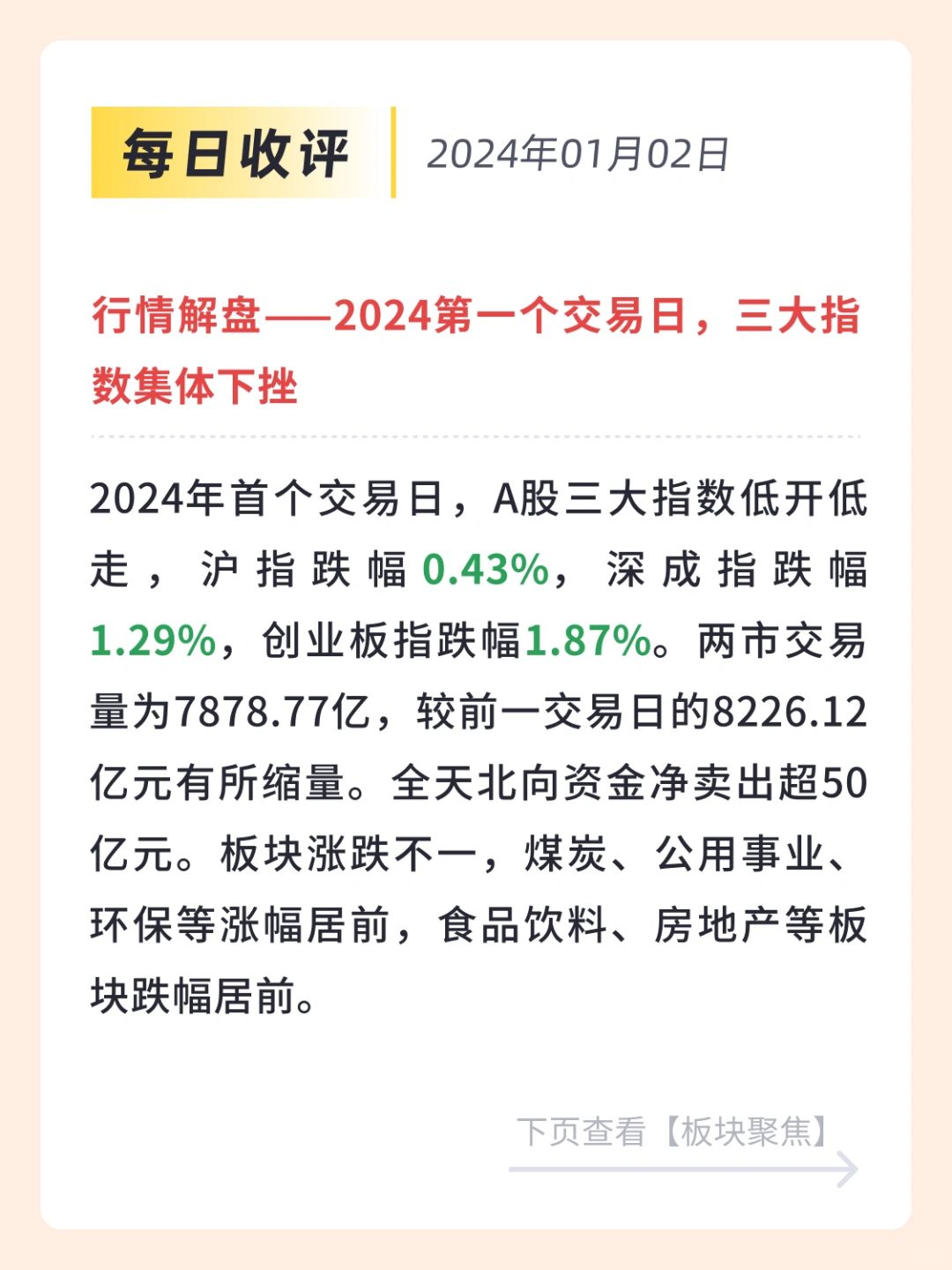 👉 2024年首个交易日,A股三大指数低开低走,沪指跌幅0.43%,深成指跌幅1.29%,创业板指跌幅1.87%。两市交易量为7878.77亿,较前一交易日的8226.12亿元有所缩量。全天北向资金净卖出超50亿元。板块涨跌不一,煤炭、公用事业、环保等涨幅居前,食品饮料、房地产等板块跌幅居前。