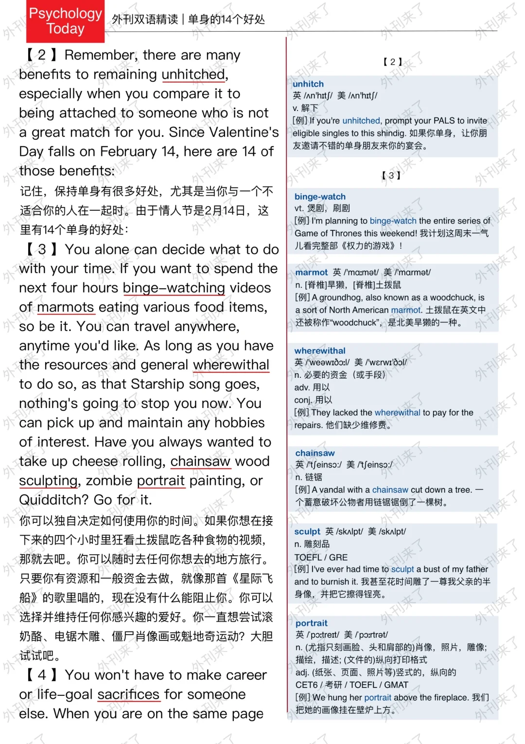 🔥英语学习必备的外刊精读 ⭐选自Psychology Today ⭐每周会从原刊中选取多篇文章精读 🏆🏆重点单词⤵️ 🏅descend 下降 🏅manufacturer 制造商 🏅jewelry 珠宝 🏅unhitched 单身的 🏅binge-watch 煲剧 🏅marmot 土拨鼠 🏅wherewithal 必要的资金 🏅portrait 肖像 🏅self-reliant 自力更生的