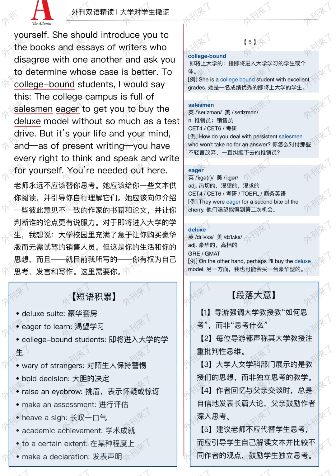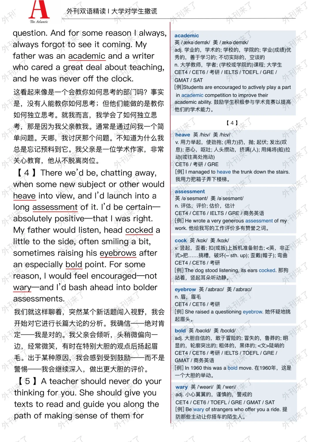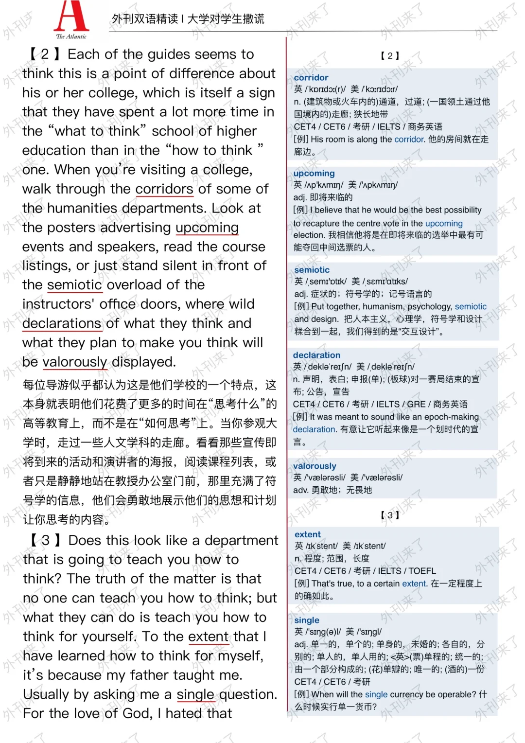 🔥英语学习必备的外刊精读 ⭐选自The Atlantic ⭐每周会从原刊中选取多篇文章精读 🏆🏆重点单词⤵️ 🏅eventually 最终 🏅sophomore 大二学生 🏅corridor 通道 🏅upcoming 即将来临的 🏅semiotic 症状的 🏅declaration 声明 🏅valorously 勇敢地 🏅assessment 评估 🏅eyebrow 眉毛 🏅bold 大胆自信的 🏅wary 小心翼翼的