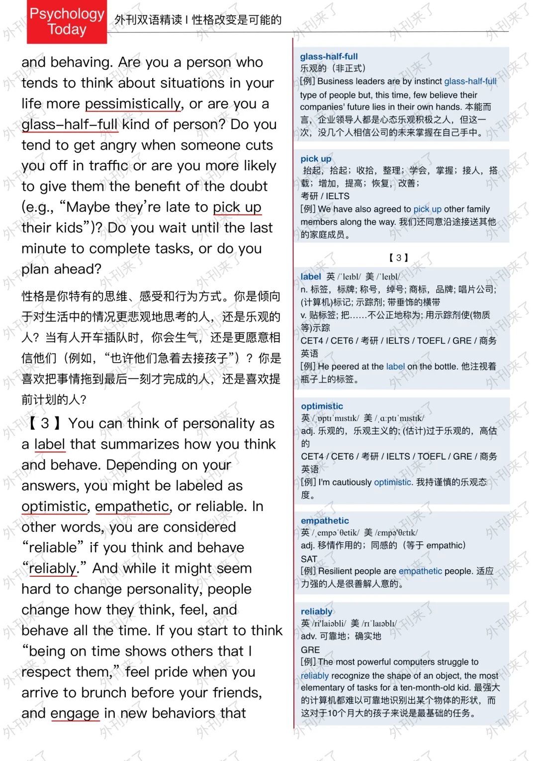 🔥英语学习必备的外刊精读 ⭐选自Psychology Today ⭐每周会从原刊中选取多篇文章精读 🏆🏆重点单词⤵️ 🏅aptitude 天资 🏅lane 道 🏅pessimistically 悲观地 🏅glass-half-full 乐观的 🏅empathetic 同感的 🏅reliably 可靠地 🏅timeliness 及时;时间性 🏅embody 体现 🏅variability 可变性