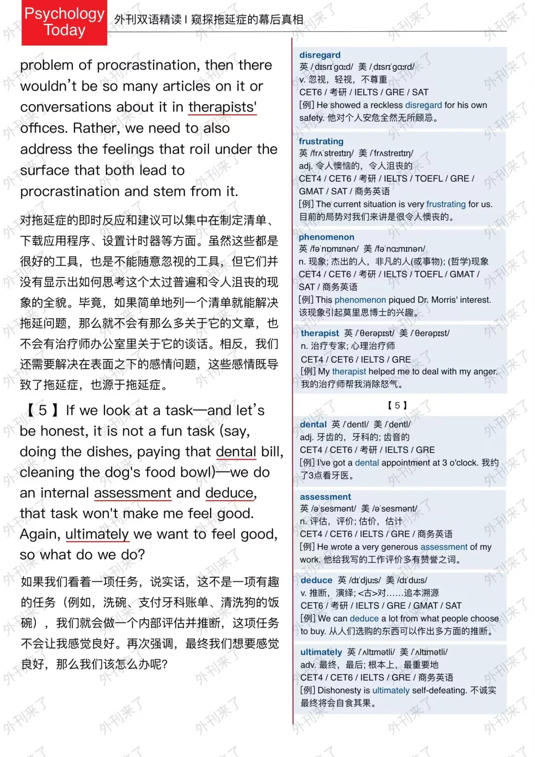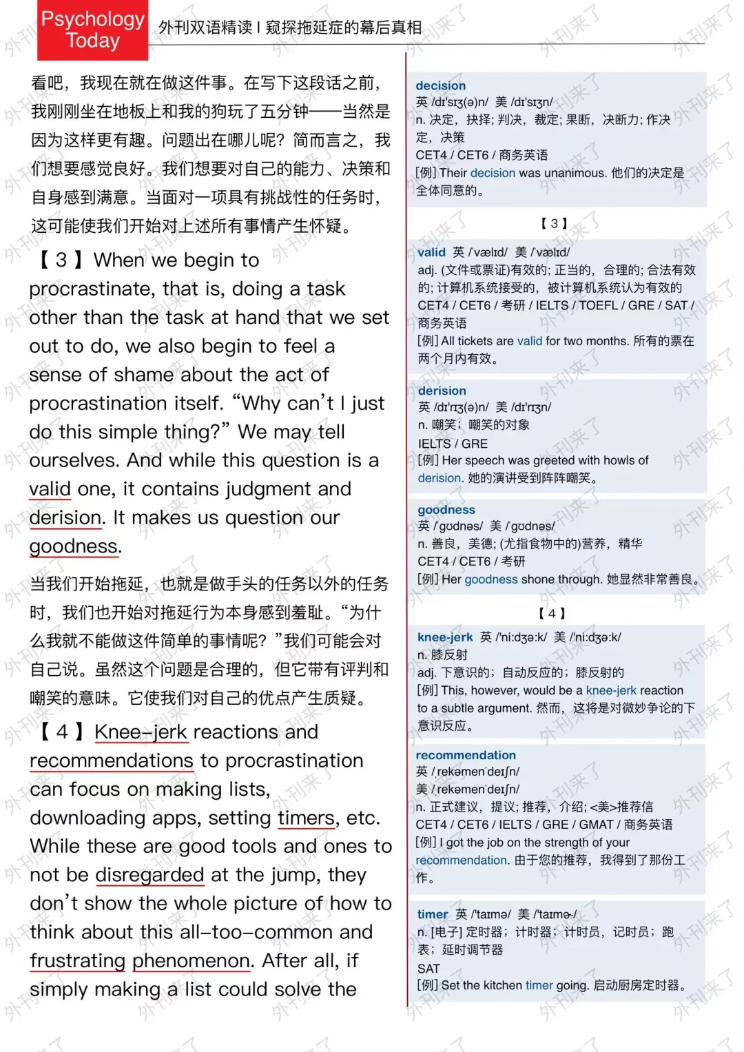 🔥英语学习必备的外刊精读 ⭐选自Psychology Today ⭐每周会从原刊中选取多篇文章精读 🏆🏆重点单词⤵️ 🏅procrastination 拖延 🏅dread 害怕 🏅valid 合理的 🏅derision 嘲笑 🏅knee-jerk 膝反应 🏅timer 定时器 🏅disregard 忽视 🏅phenomenon 现象 🏅dental 牙齿的 🏅deduce 推断