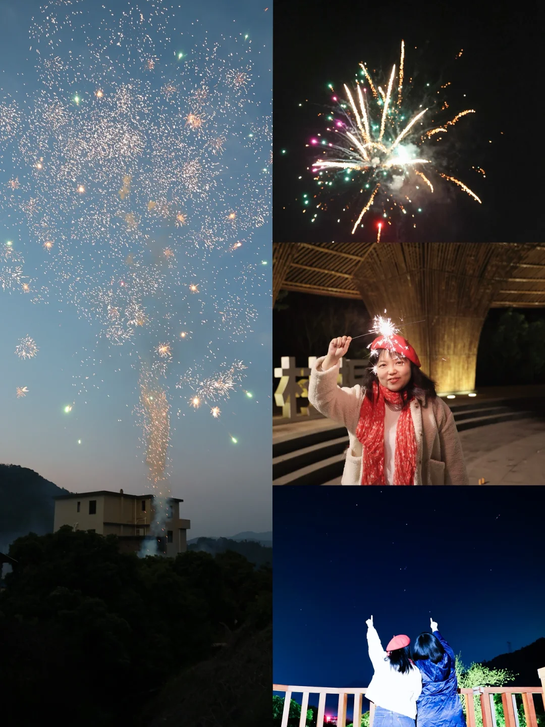 入夜,在凤凰广场欣赏烟花🎆,随后在小木屋的天台来一杯🥃梅子酒,品尝烧烤🍡,享受宁静的星空下宵夜,感受春节度假的悠闲休闲感觉。