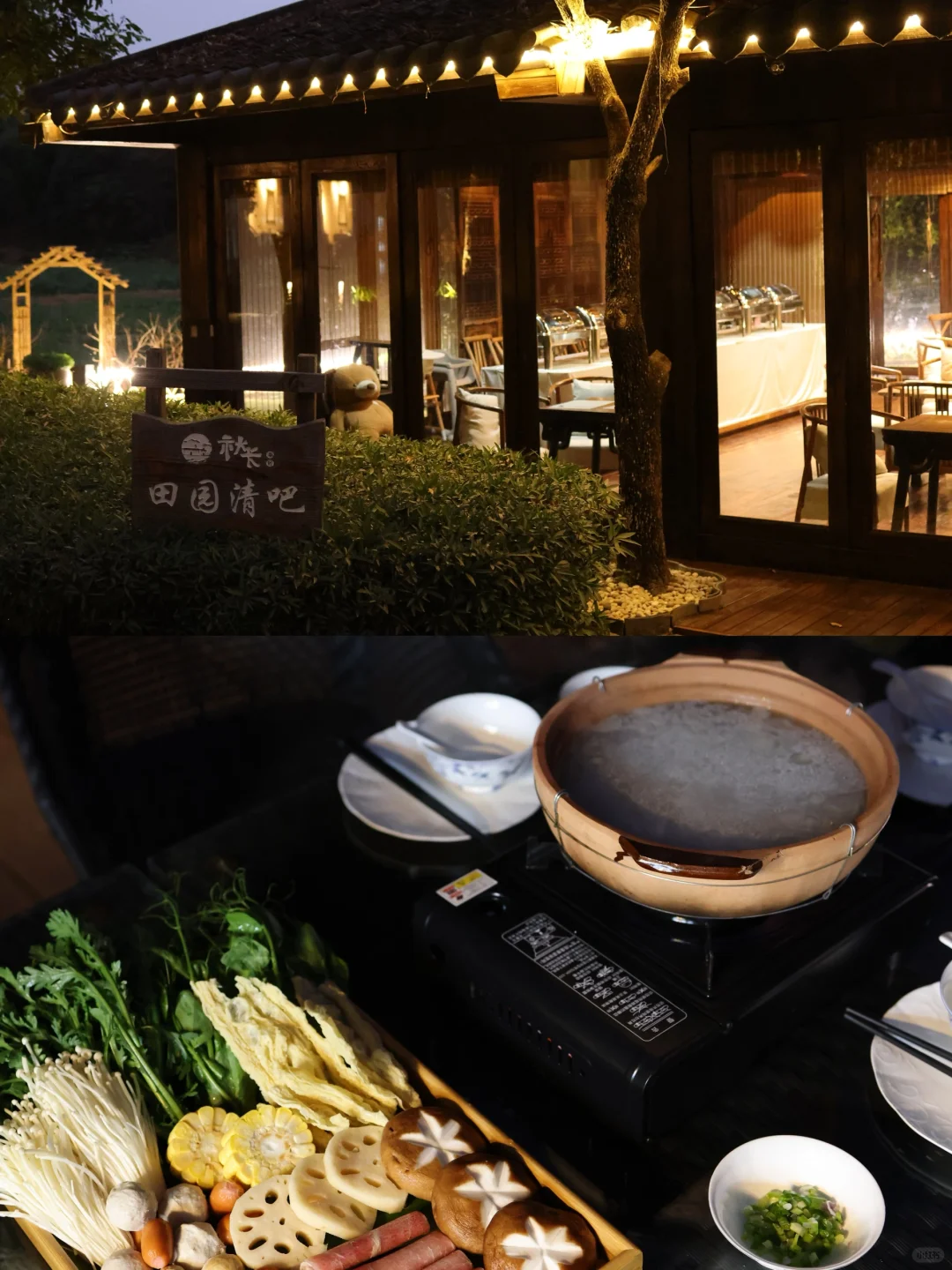🍽晚餐选在民宿内田园清吧,享受古法烹饪调制的田园走地鸡火锅,鲜香浓郁的味道真是让心头温暖。蔬菜也是民宿自己种植采摘的,主打一个绿色充能,健康续航!
