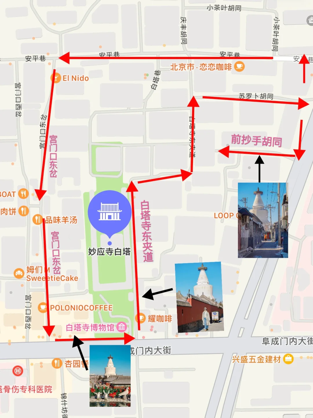 白塔寺东夹道—苏罗卜胡同—前抄手胡同—安平巷—宫门口东岔—咖啡店露台