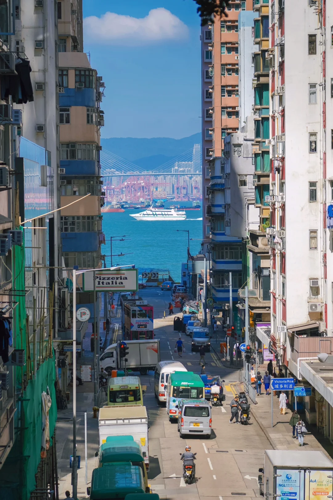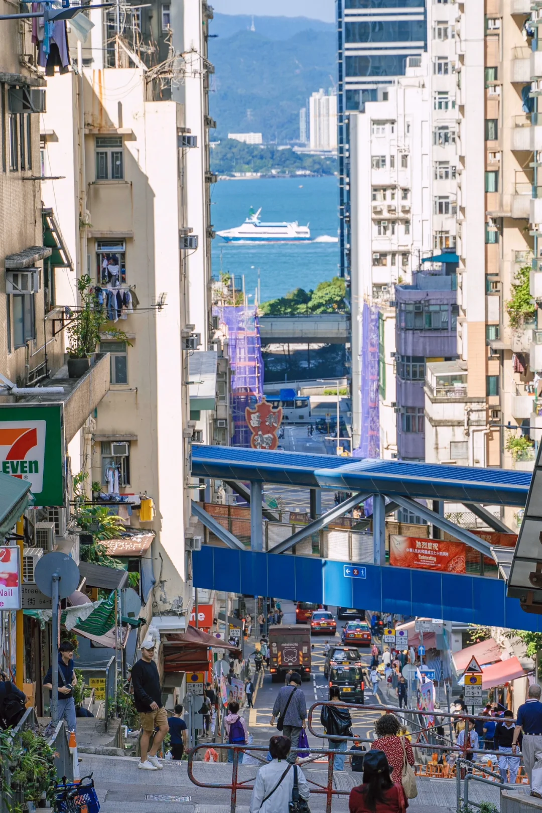 这个机位需要走到西营盘街市第三街,在高处拍就能拍出有海有街头景的冲击力画面。这边很有生活气息,街市,生活小商店,本土小吃店都有。