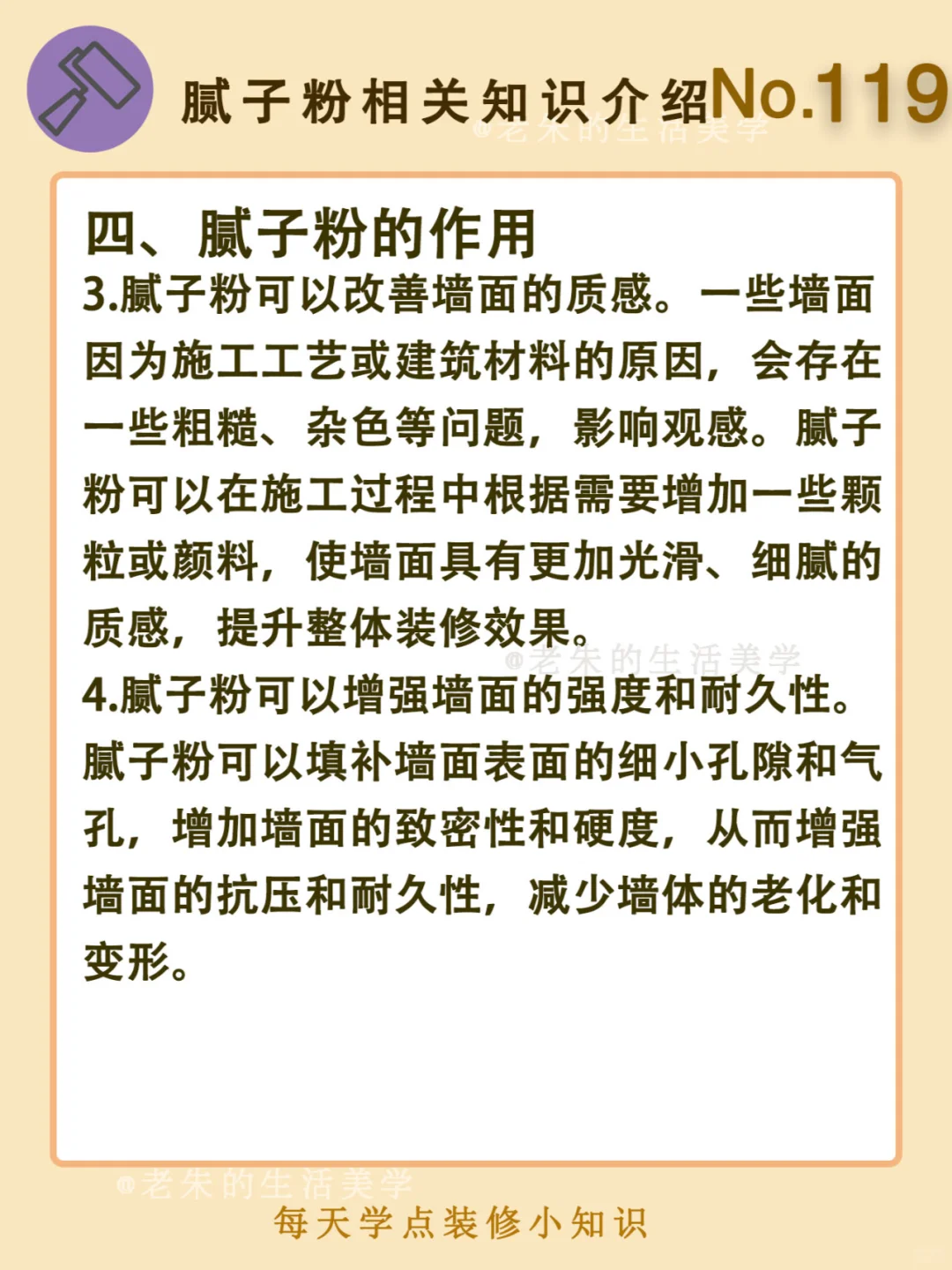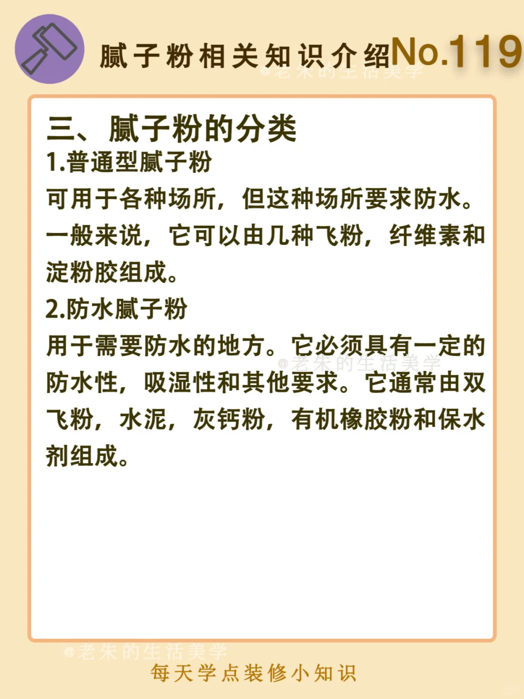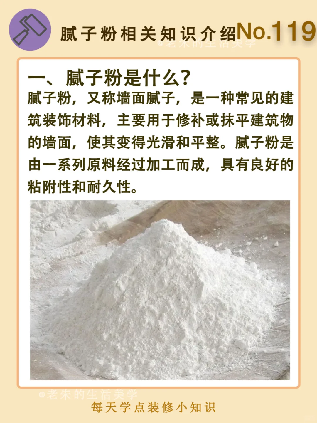 🔆 一、腻子粉是什么? 二、腻子粉的优点 三、腻子粉的分类 四、腻子粉的作用 🔆 我是老朱 📍坐标天津 前上市公司金牌工长🏅 30年施工经验🛠 承接天津新房装修/老房改造 精心整理关于设计&施工&装修的攻略📝 关注我每日更新🗓 也可以在评论区留下您宝贵的想法与建议💓 让您装修不走弯路✅