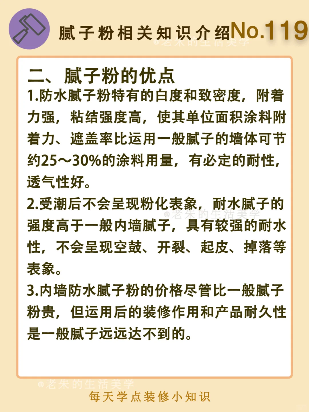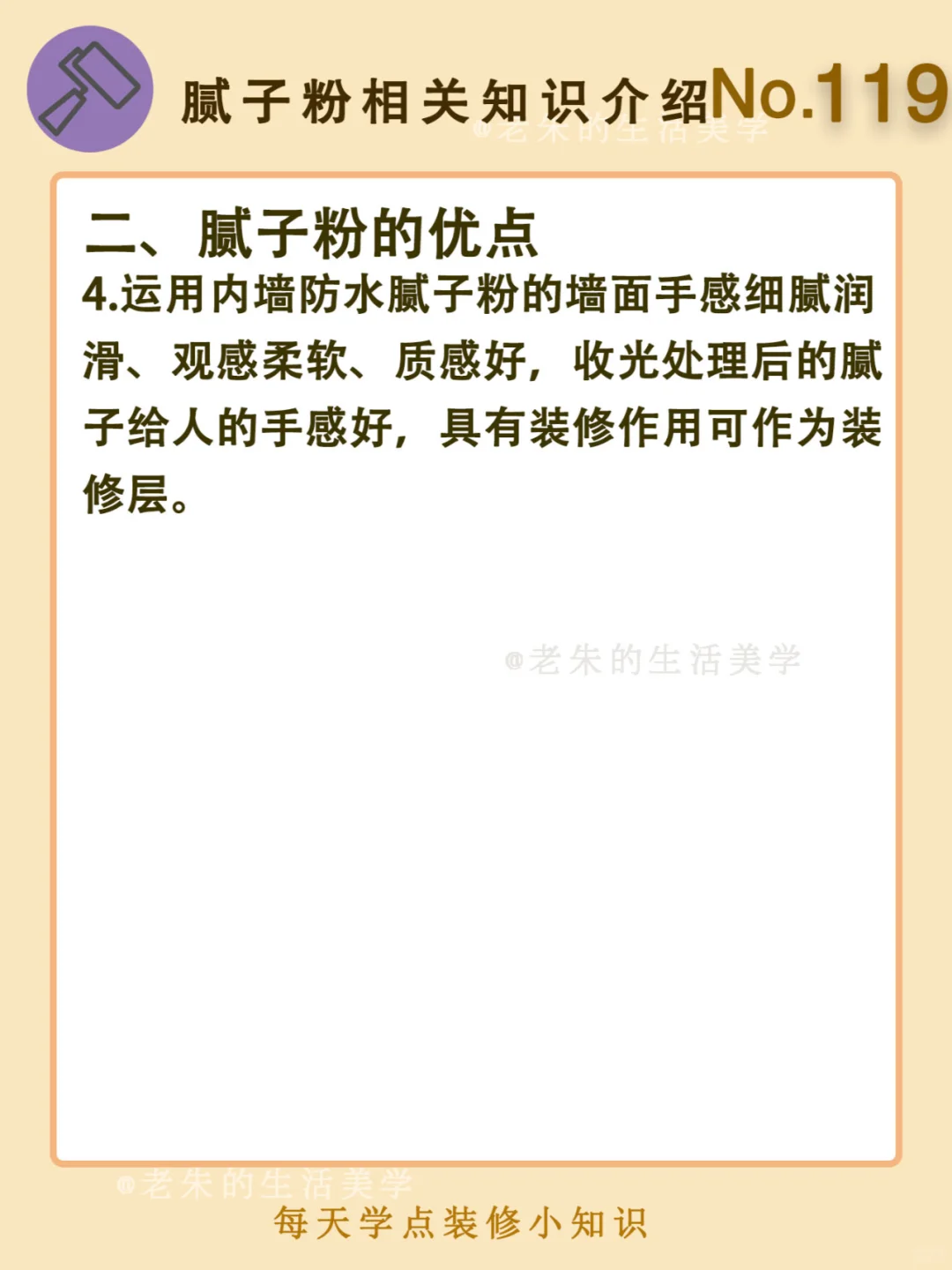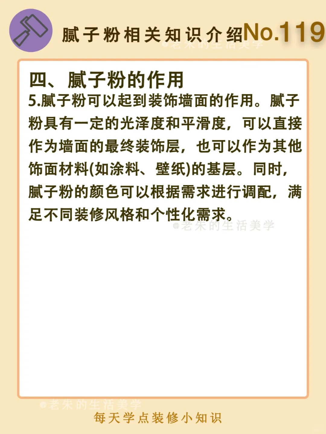 🔆 一、腻子粉是什么? 二、腻子粉的优点 三、腻子粉的分类 四、腻子粉的作用 🔆 我是老朱 📍坐标天津 前上市公司金牌工长🏅 30年施工经验🛠 承接天津新房装修/老房改造 精心整理关于设计&施工&装修的攻略📝 关注我每日更新🗓 也可以在评论区留下您宝贵的想法与建议💓 让您装修不走弯路✅