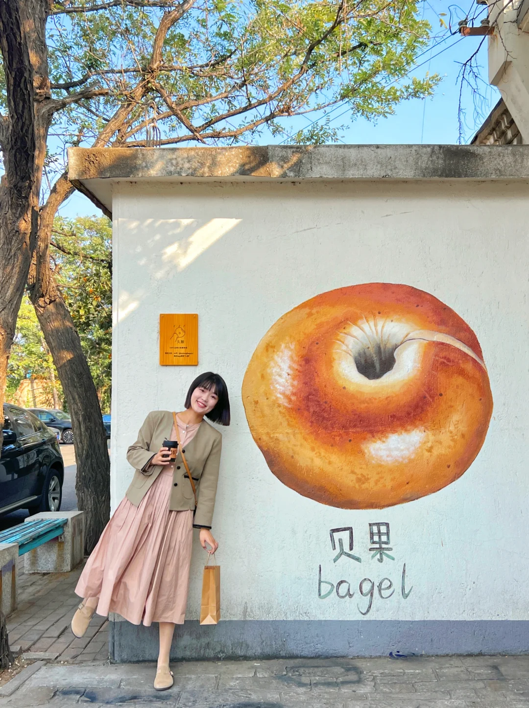 1⃣️可爱的贝果墙在指鹿咖啡旁边,在园区往里一点的位置,橘气拿铁也挺好喝🍊