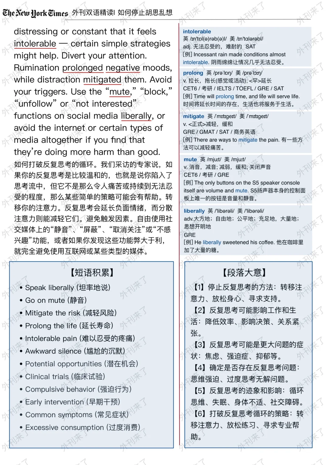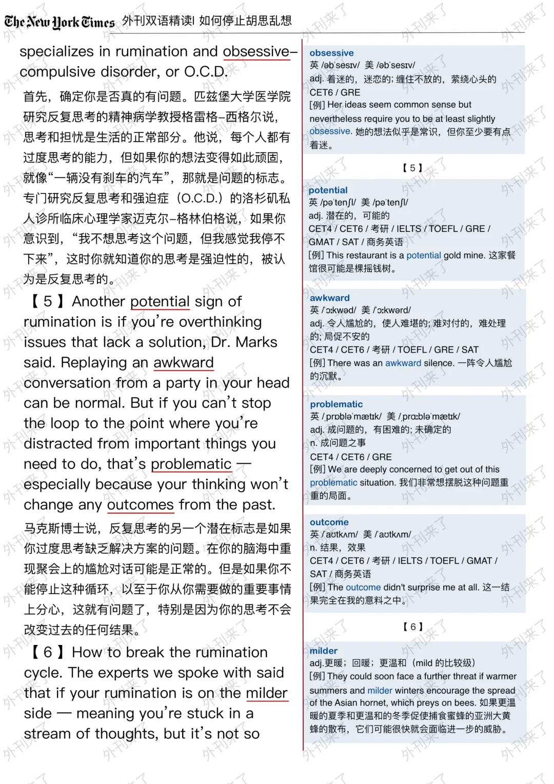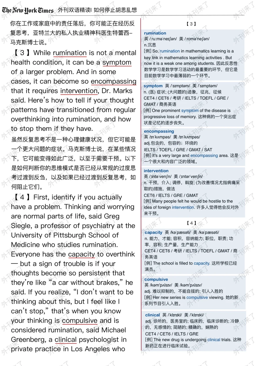 🔥英语学习必备的外刊精读 ⭐选自The New York Times ⭐每周会从原刊中选取多篇文章精读 🏆🏆重点单词⤵️ 🏅ruminate 沉思,反复思考 🏅loop 循环 🏅symptom 症状 🏅encompassing 包容的 🏅capacity 能力 🏅compulsive 难以抑制的 🏅obsessive 着迷的 🏅awkward 令人尴尬的 🏅intolerable 无法忍受的 🏅mitigate 减轻 🏅mute 静音