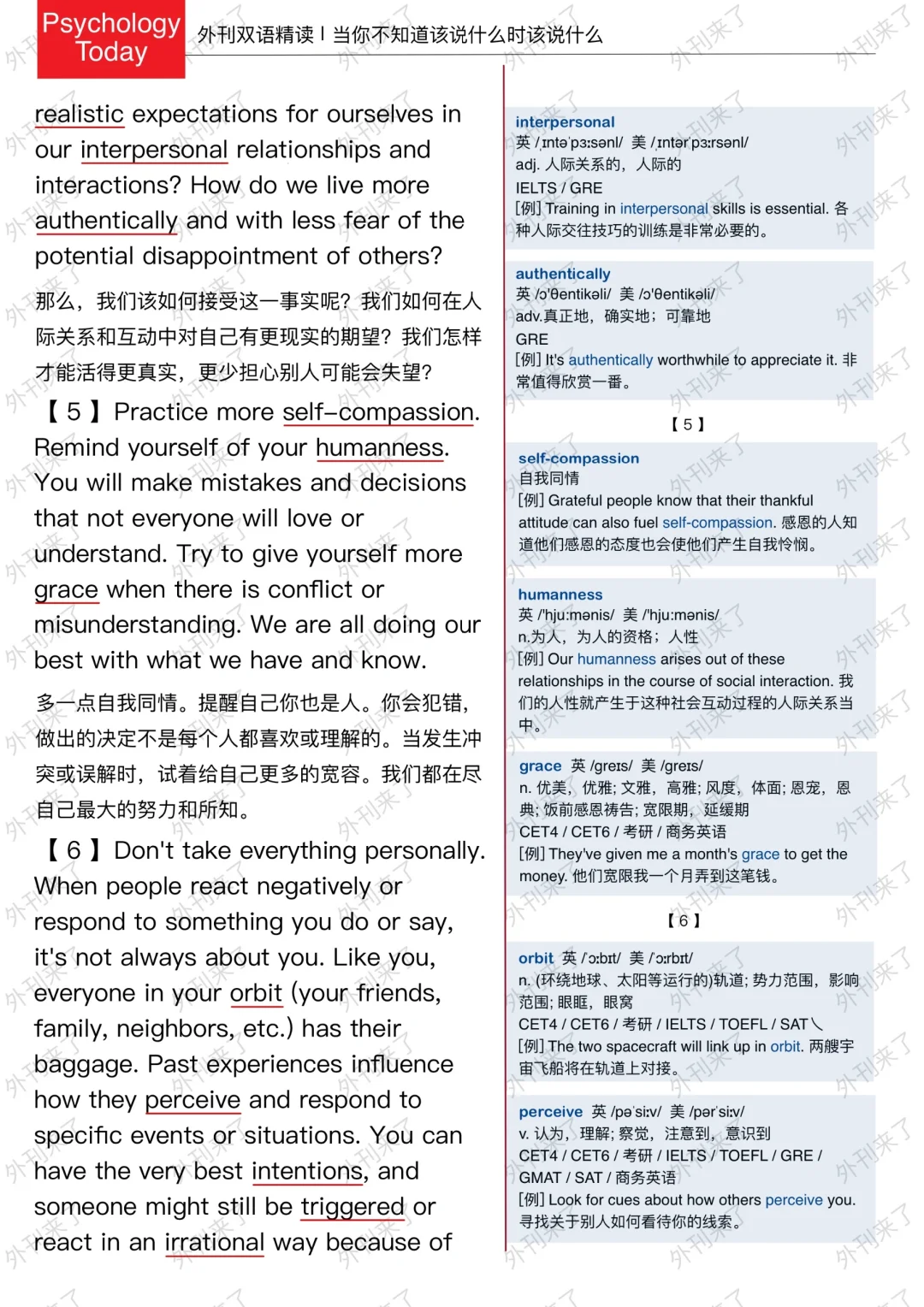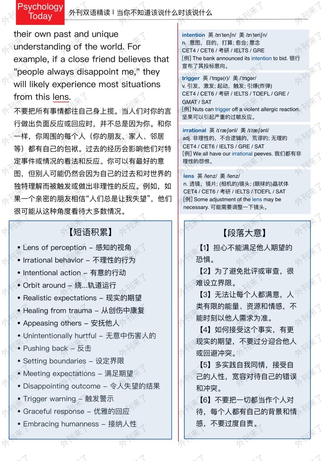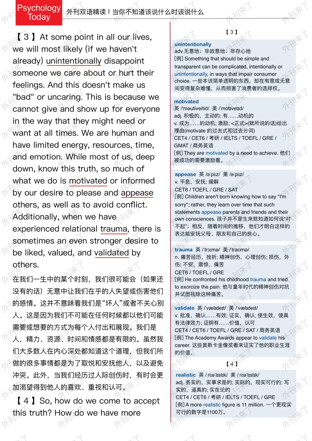 🔥英语学习必备的外刊精读 ⭐选自Psychology Today ⭐每周会从原刊中选取多篇文章精读 🏆🏆重点单词⤵️ 🏅boundary 边界 🏅potential 潜在的 🏅scrutiny 仔细观察 🏅unintentionally 无意地 🏅appease 安抚 🏅trauma 心理创伤 🏅validate 认可 🏅realistic 实际的 🏅interpersonal 人际关系的 🏅authentically 真正地 🏅orbit 影响范围 🏅trigger 引发