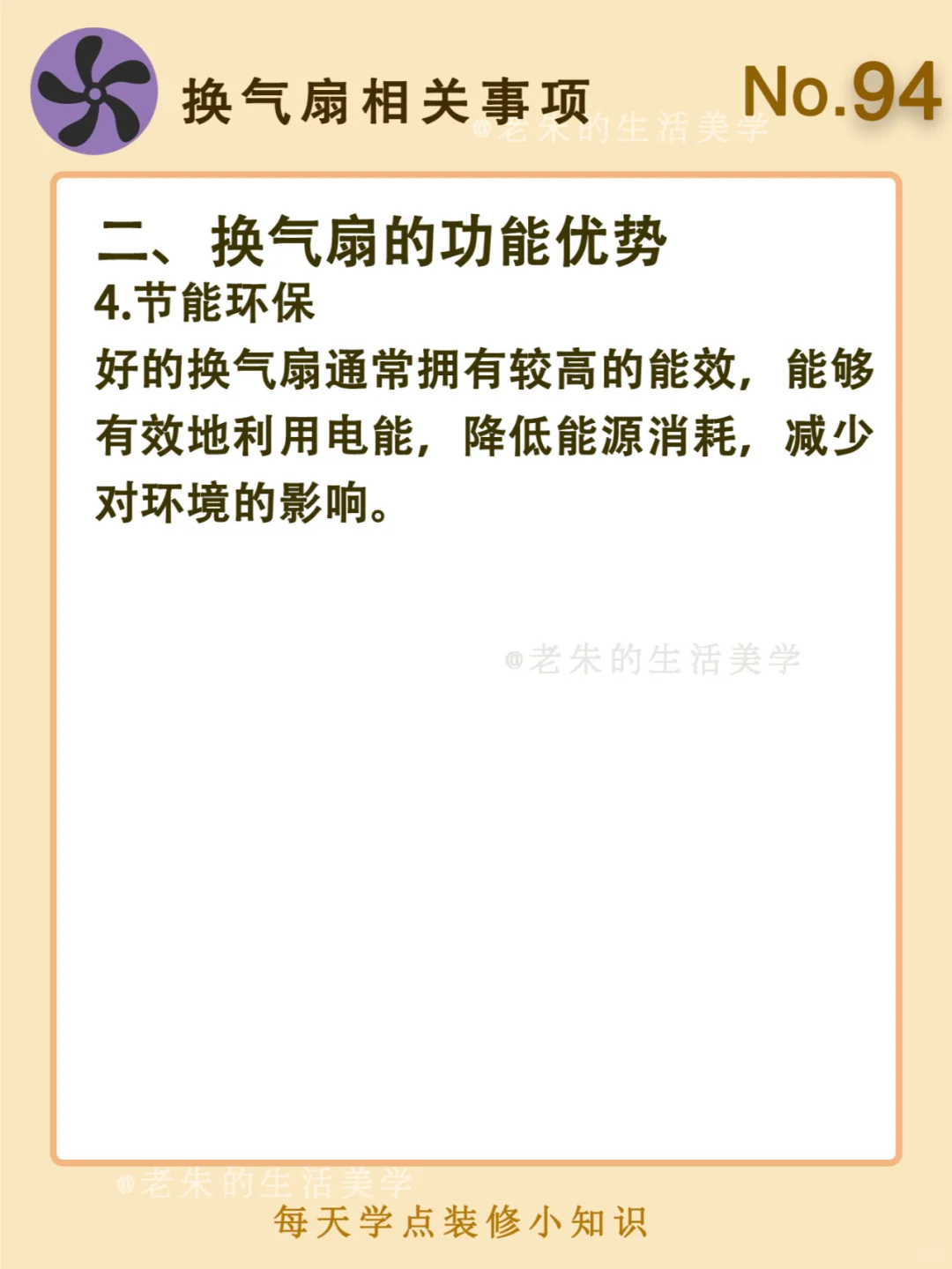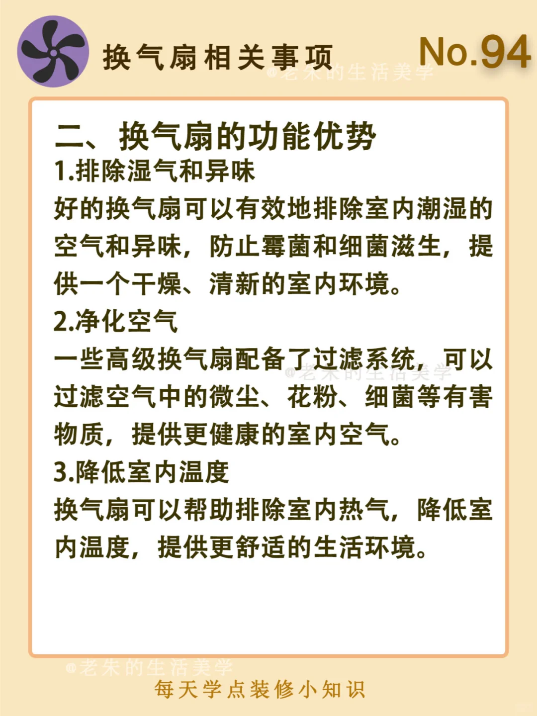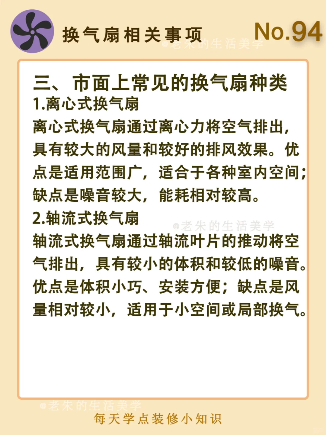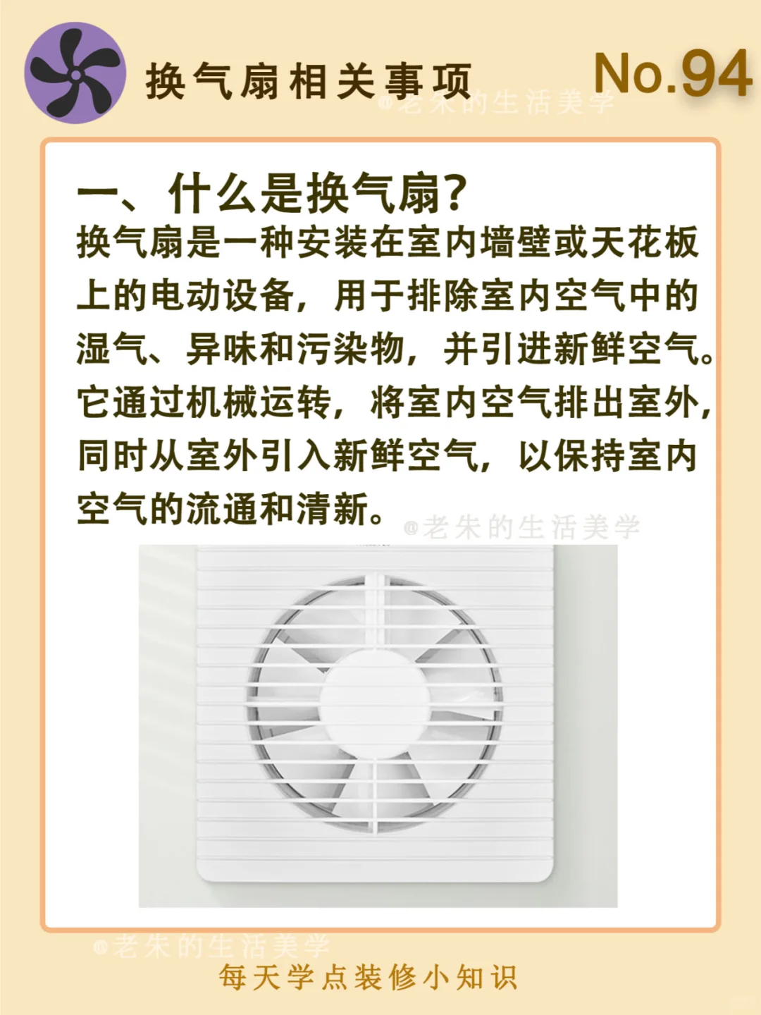 🔆 一、什么是换气扇 二、换气扇的功能优势 三、市面上常见的换气扇种类 四、换气扇注意事项 🔆 我是老朱 📍坐标天津 前上市公司金牌工长🏅 30年施工经验🛠 承接天津新房装修/老房改造 精心整理关于设计&施工&装修的攻略📝 关注我每日更新🗓 也可以在评论区留下您宝贵的想法与建议💓 让您装修不走弯路✅